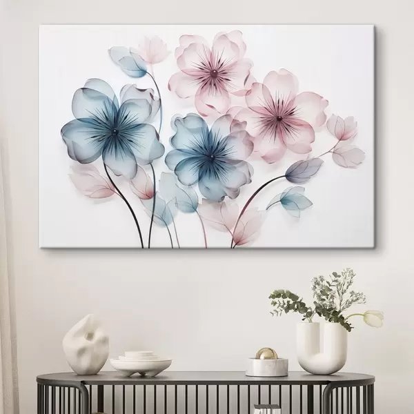 Peinture Fleurs translucides roses et bleues avec étamines et tiges visibles Art. s44405
