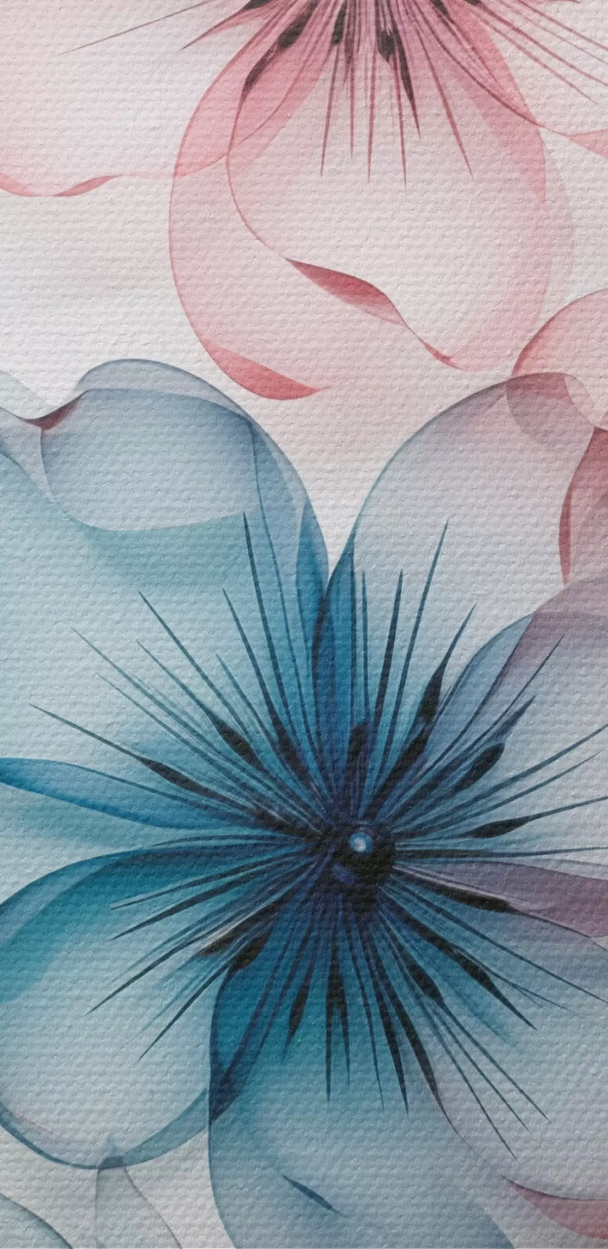 Peintures Fleurs translucides roses et bleues avec étamines et tiges visibles s44405