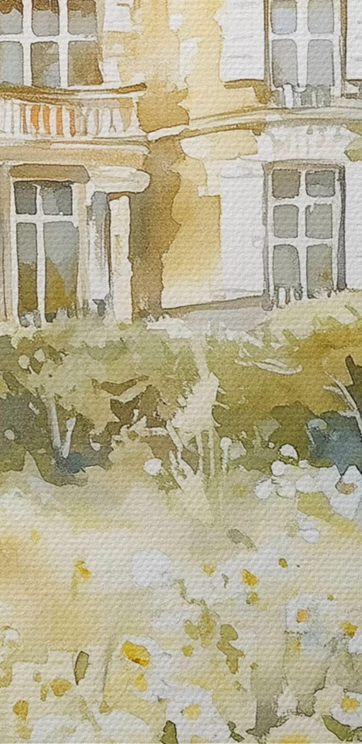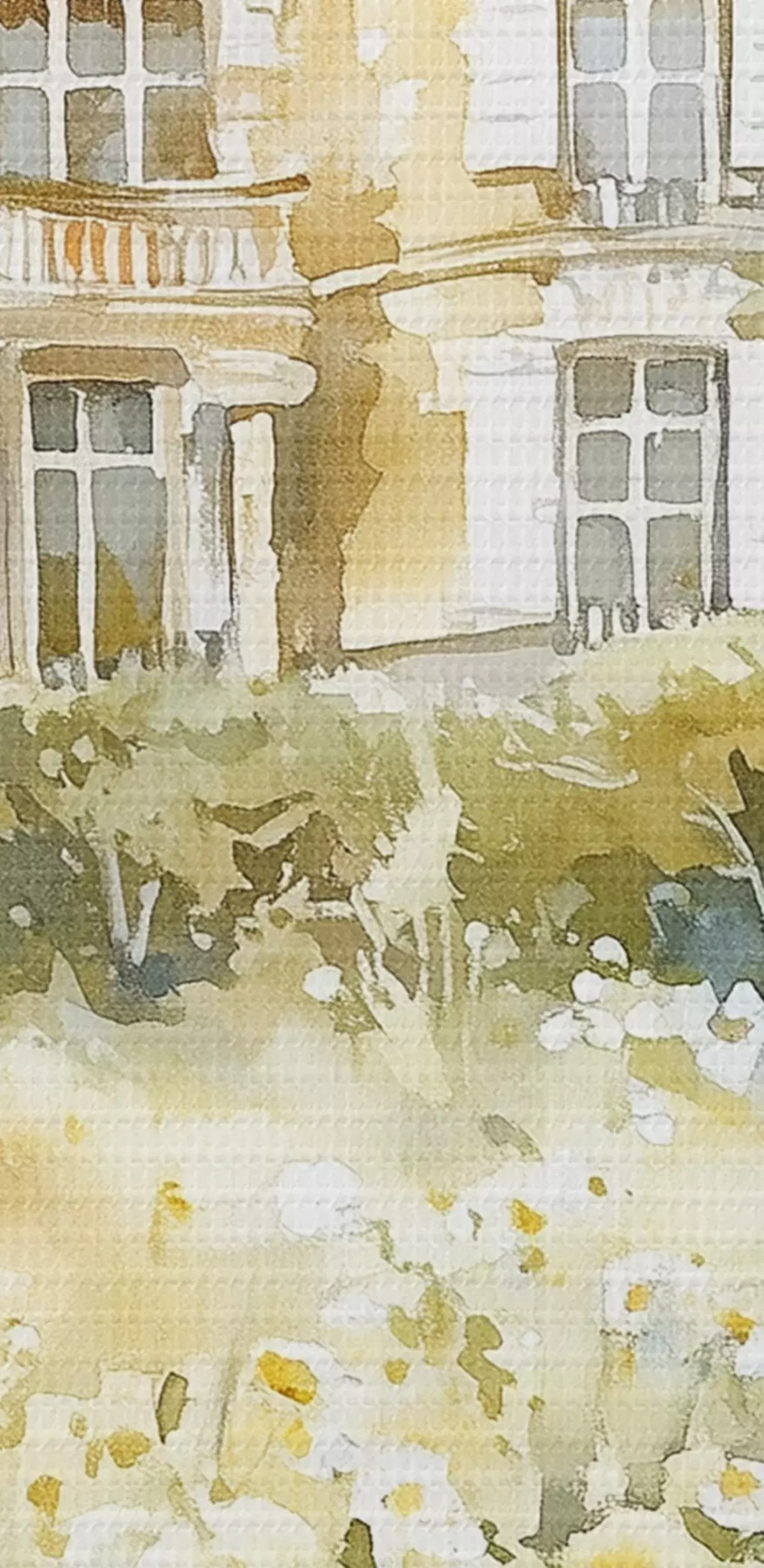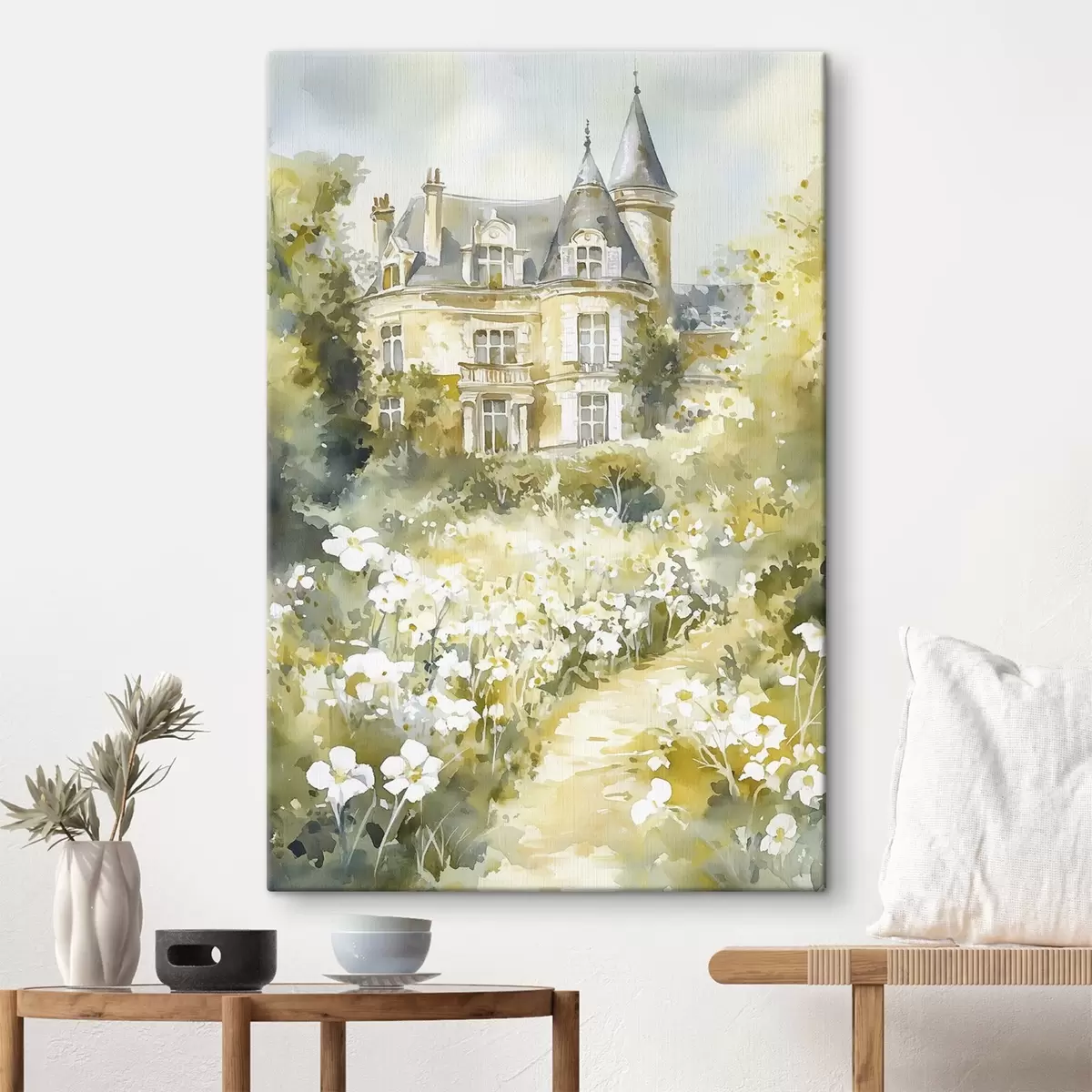 Peintures Beau château avec de la verdure et des fleurs blanches, style aquarelle s44506