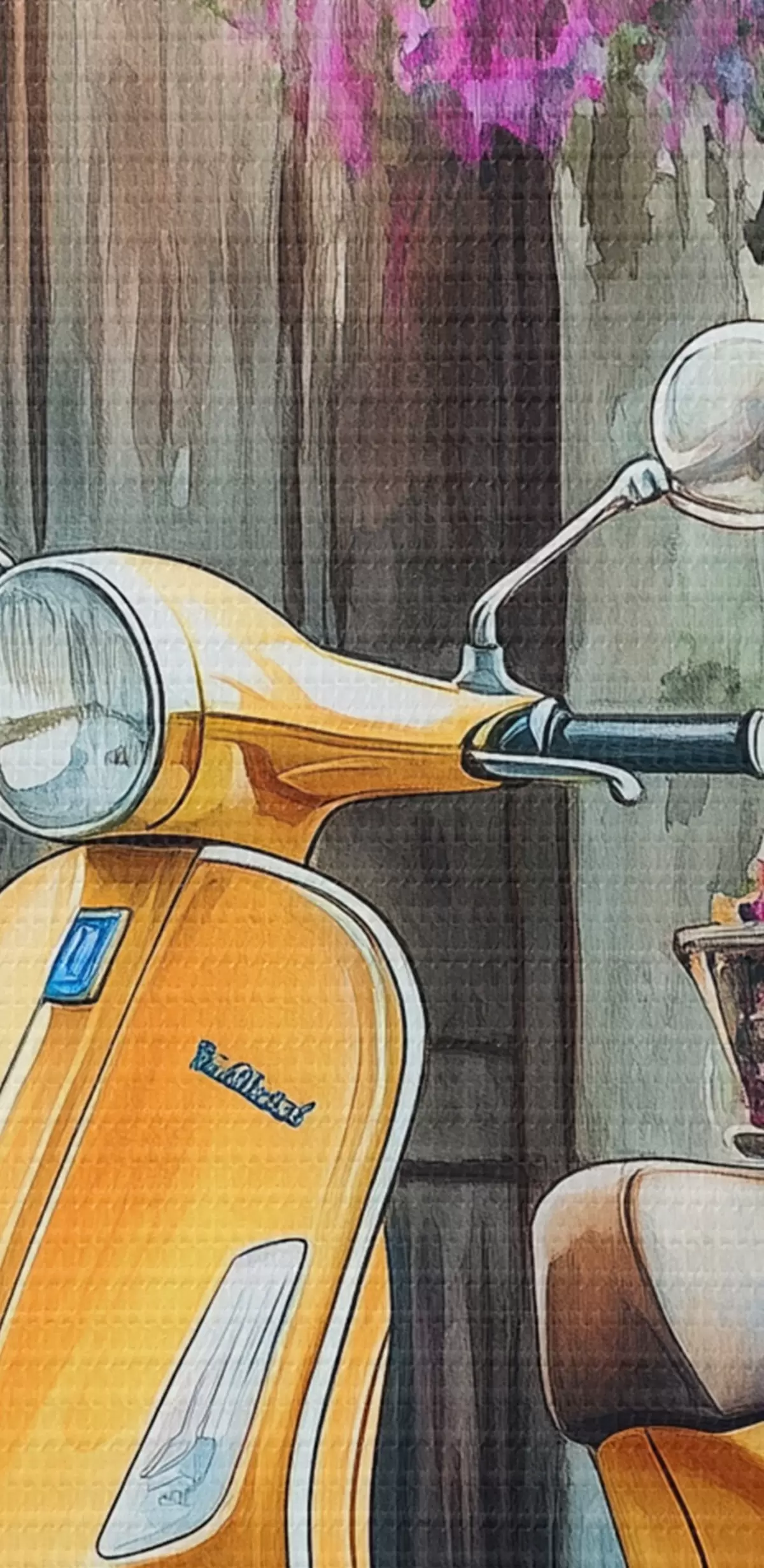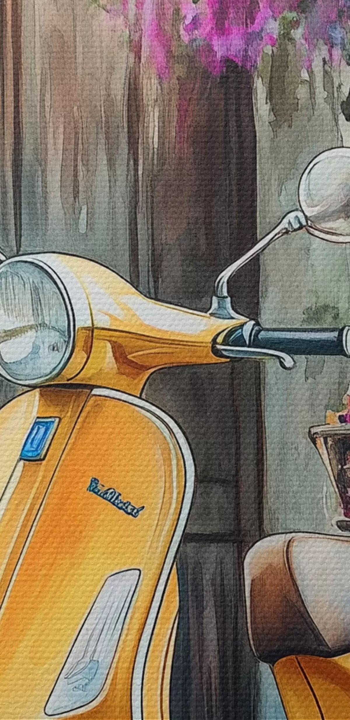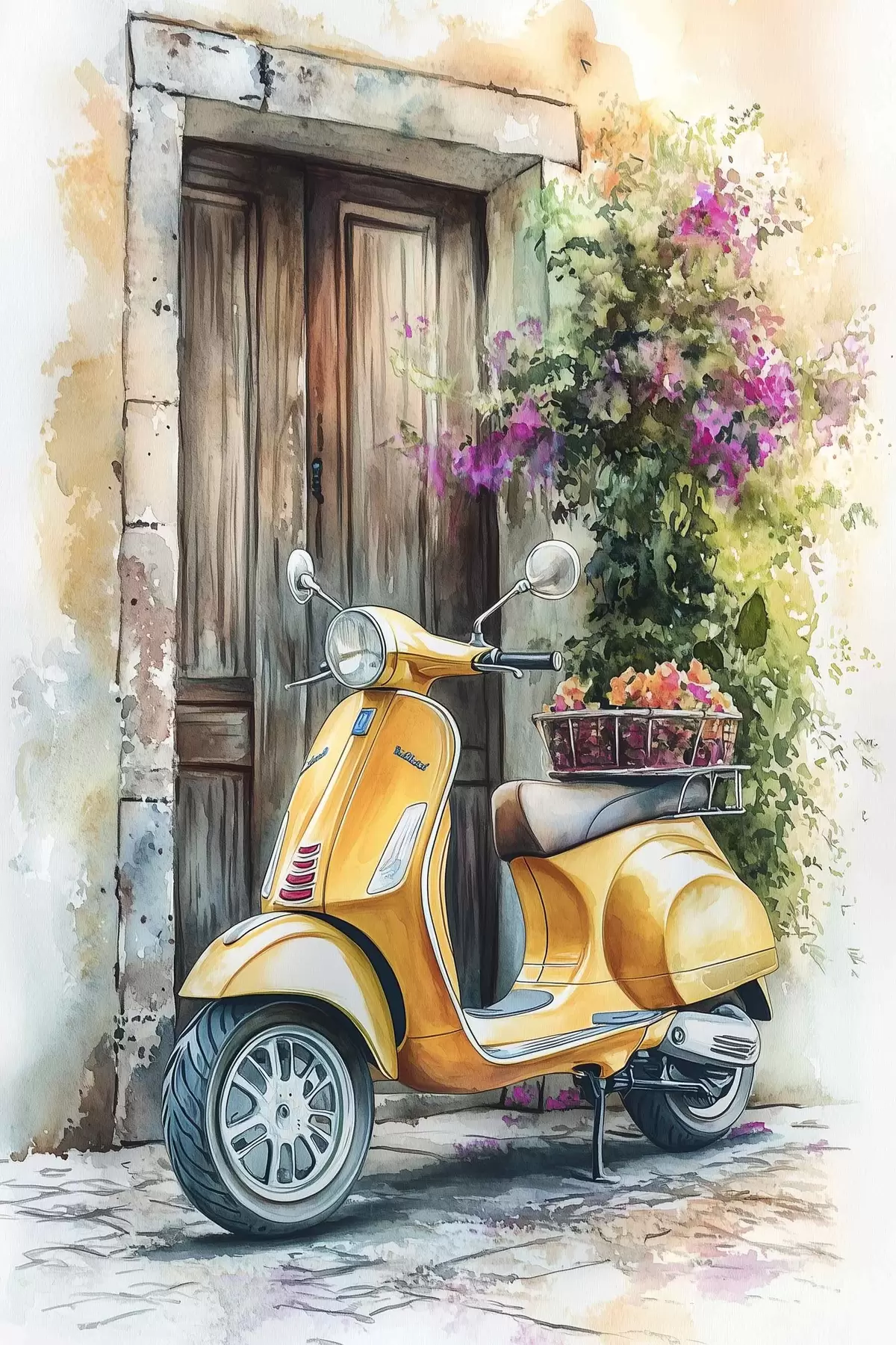 Peinture Scooter Vespa jaune près d'une porte en bois avec des fleurs Art. s44607