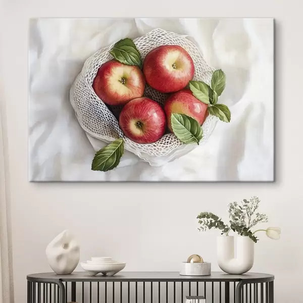 Peinture Pommes rouges dans un sac en lin avec des feuilles de menthe, style rustique, fruits Art. s44609