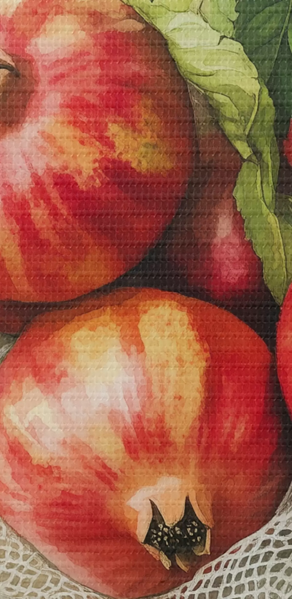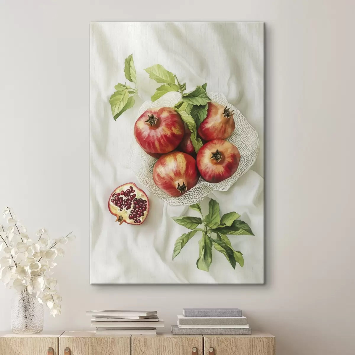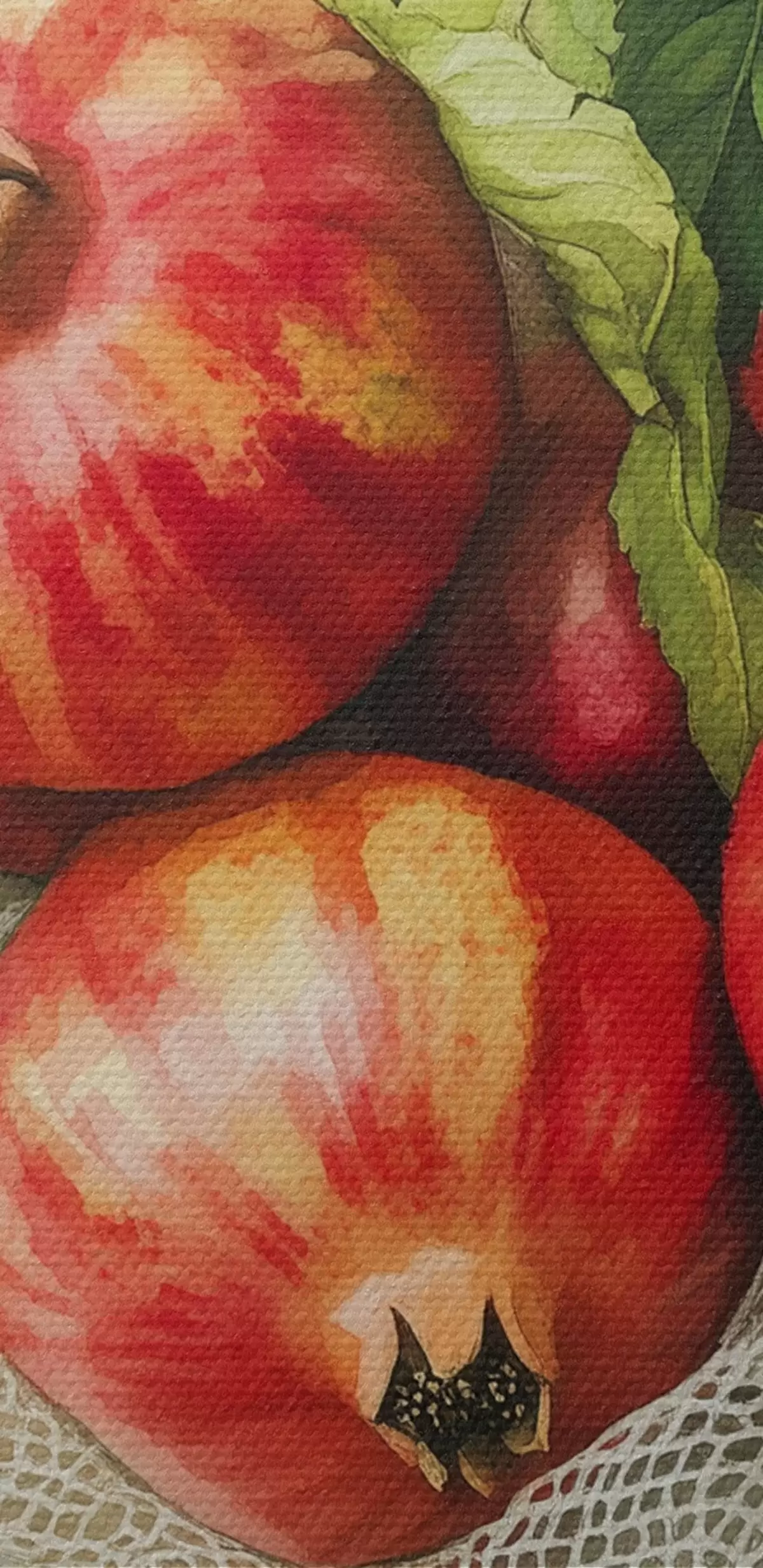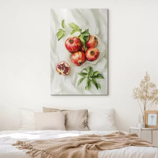 Peinture Grenades avec feuilles de menthe sur les nappes en lin, style rustique Art. s44611