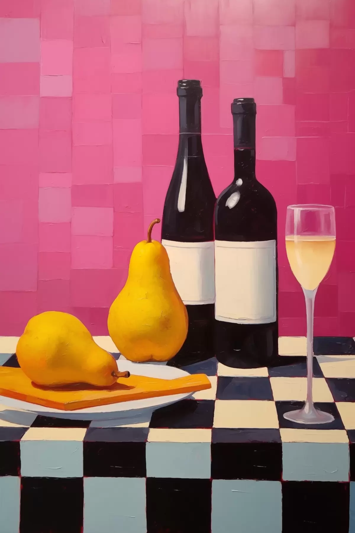 Peintures Poires, un verre de vin et deux bouteilles de vin s44683