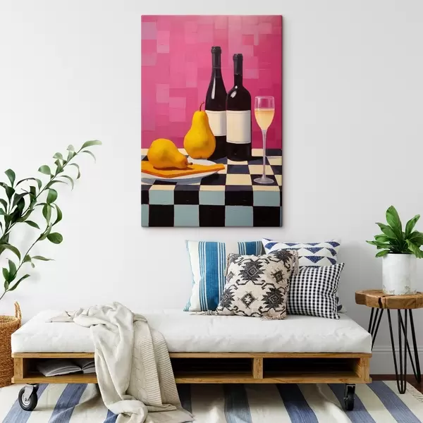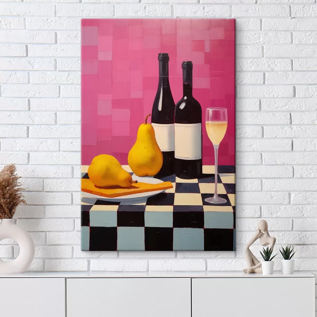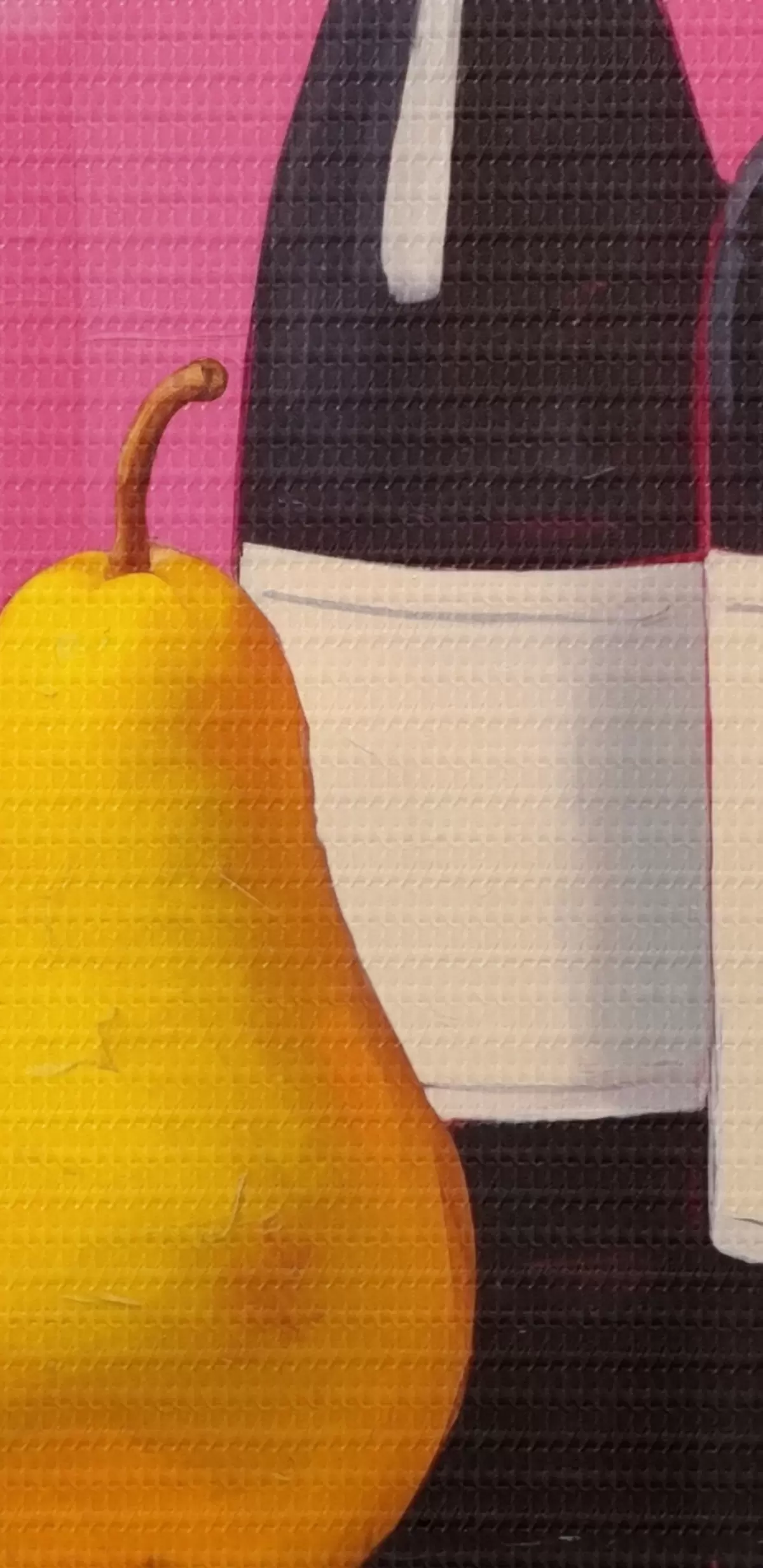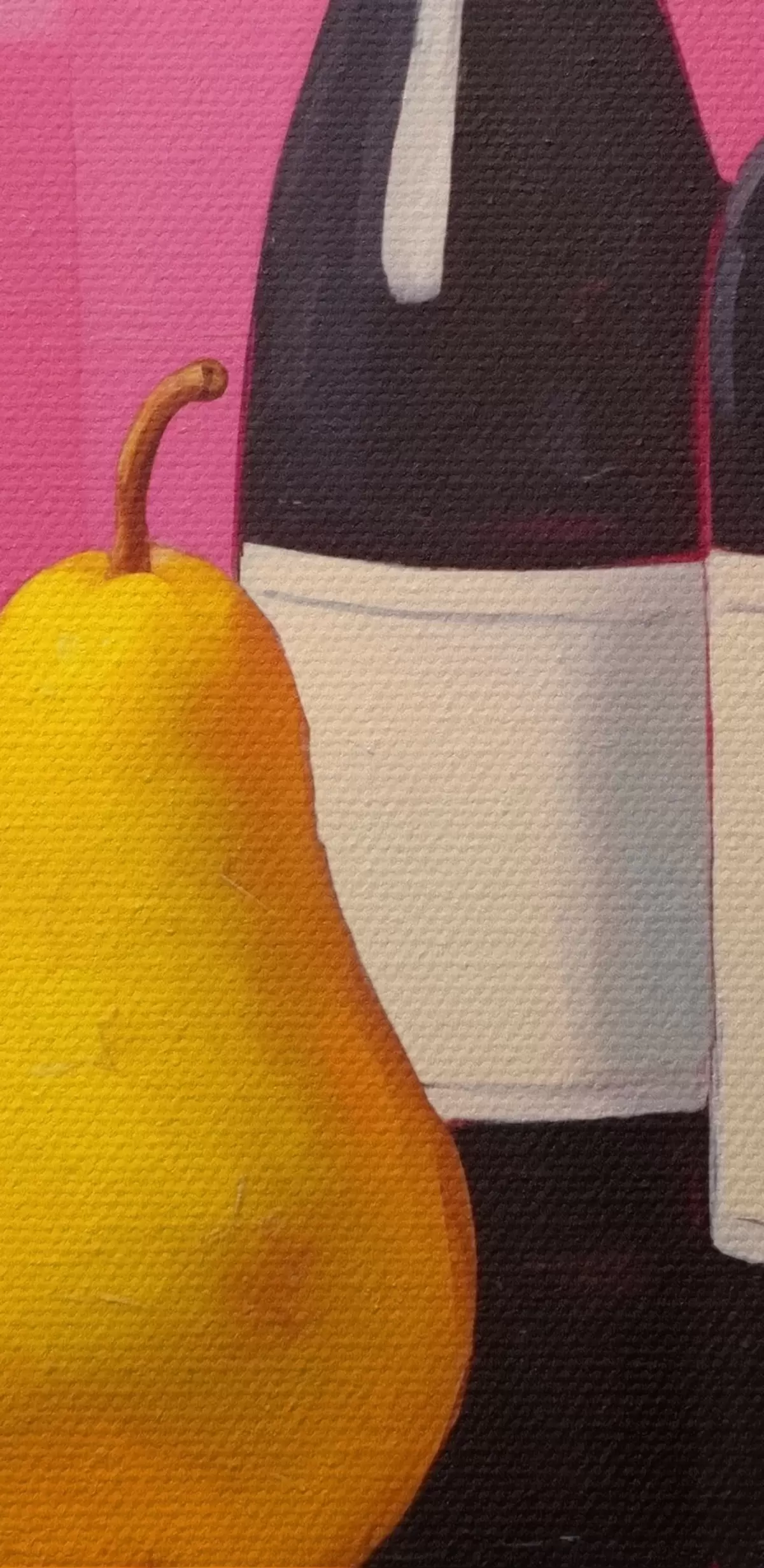 Peinture Poires, un verre de vin et deux bouteilles de vin Art. s44683
