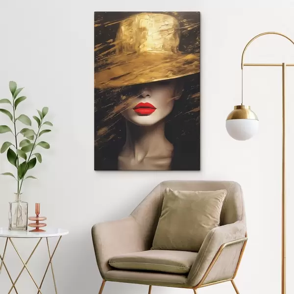 Peinture Visage féminin avec rouge à lèvres rouge sous un chapeau large Art. s44691