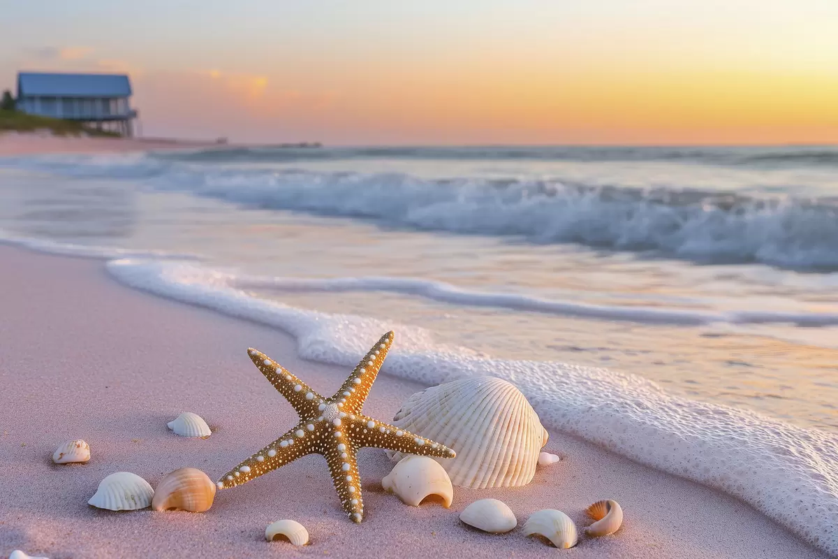 Peintures Côte maritime avec étoiles de mer, coquillages et vagues s44714