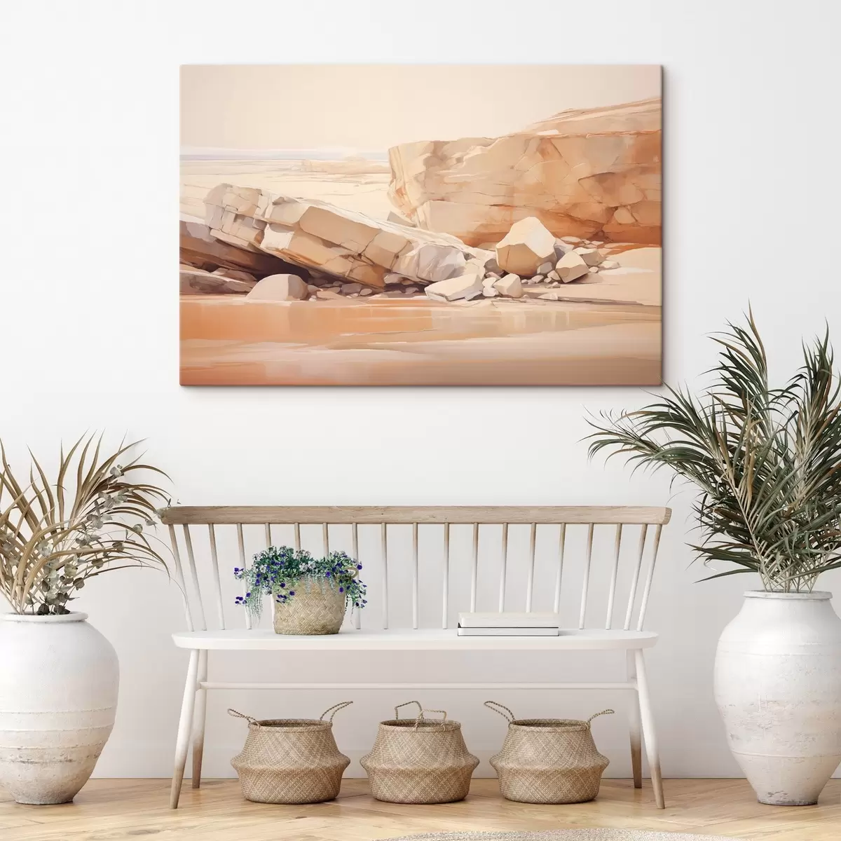 Peinture Paysage minimaliste de plage rocheuse avec de grands rochers marron clair et de l'eau claire Art. s44865