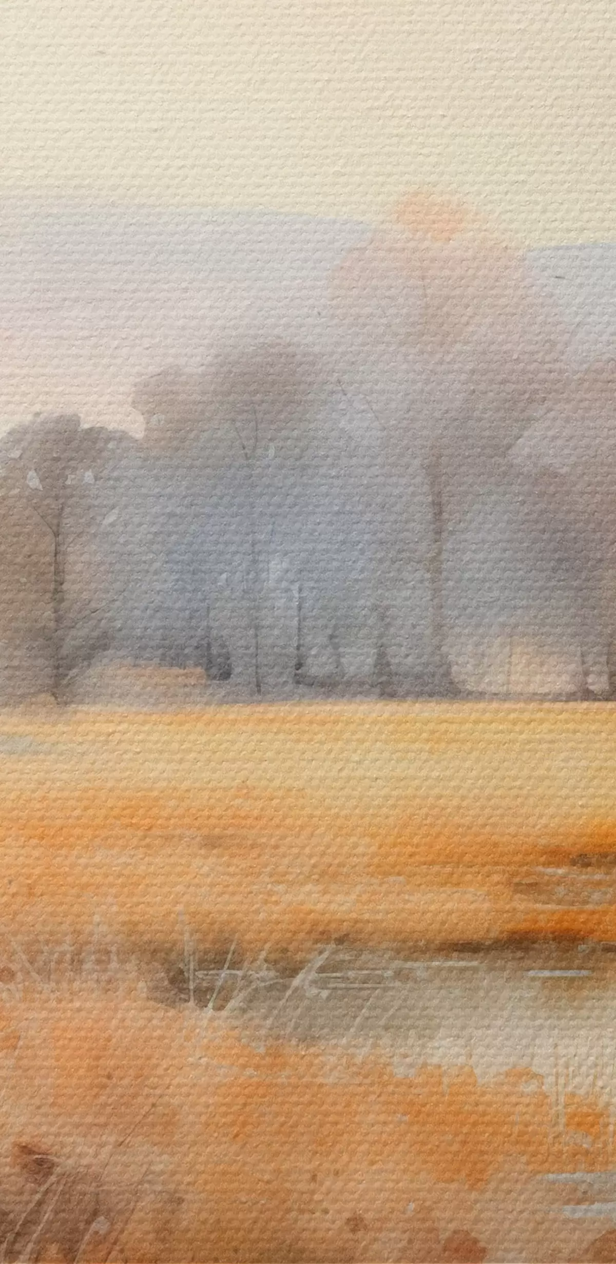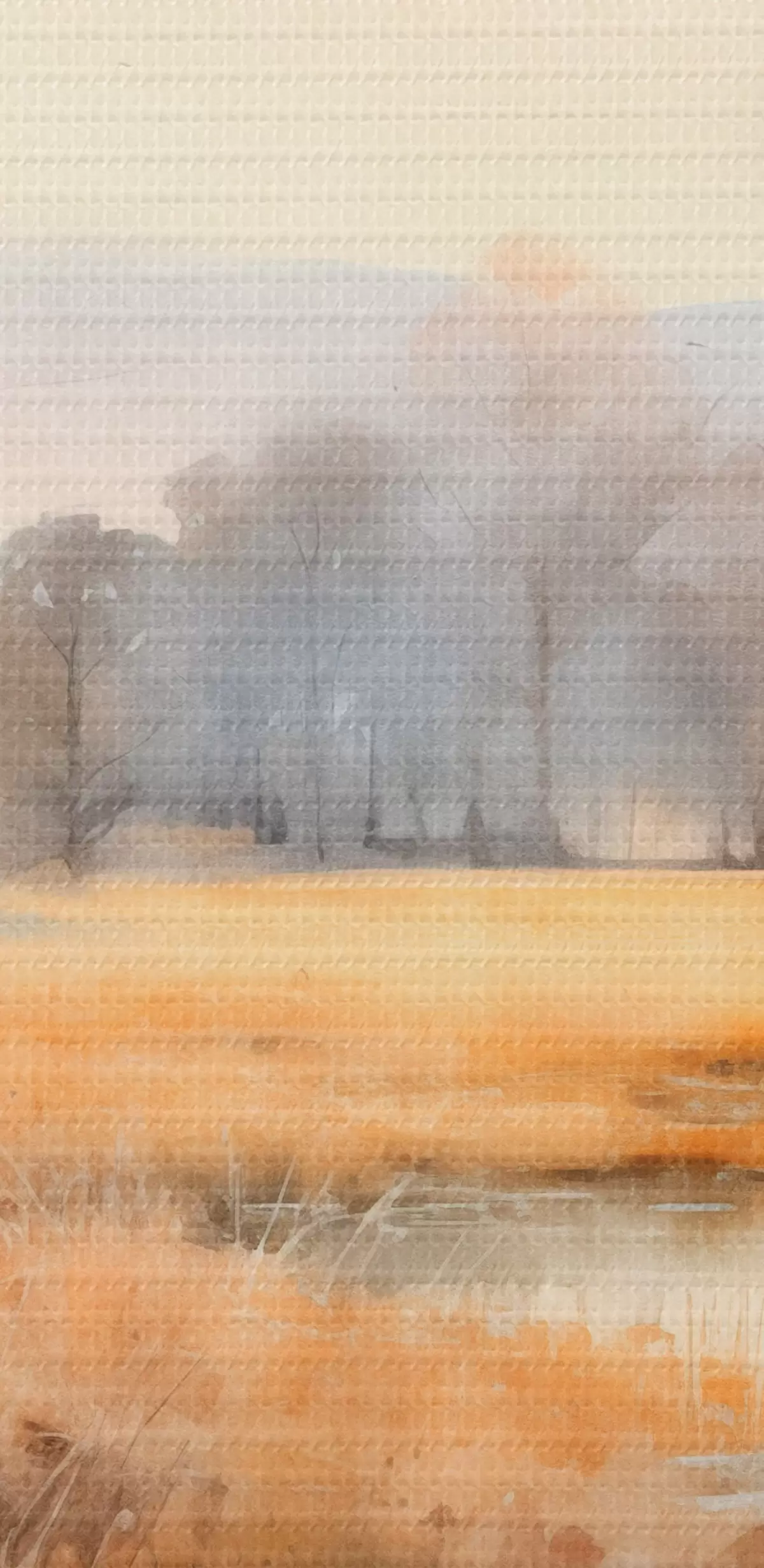 Peinture Une peinture de paysage tranquille et texturée imitant les roseaux et les arbres dénudés, l'eau calme sous un ciel.. Art. s44867