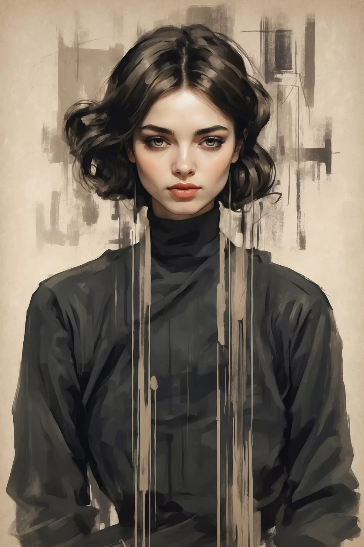 Peintures Portrait d'une femme aux cheveux courts et noirs sur fond abstrait s44890