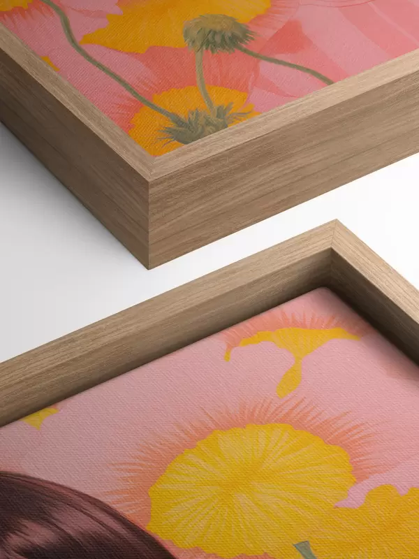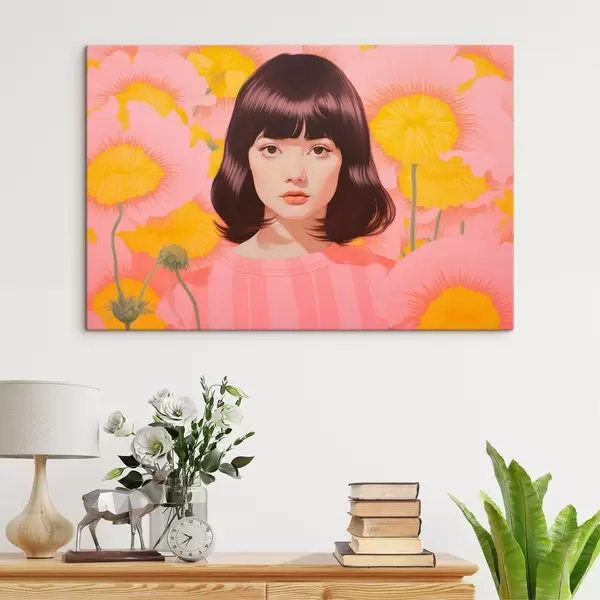 Peinture Portrait minimaliste décoratif d'une jeune fille asiatique dans un champ de fleurs jaunes et roses Art. s44924