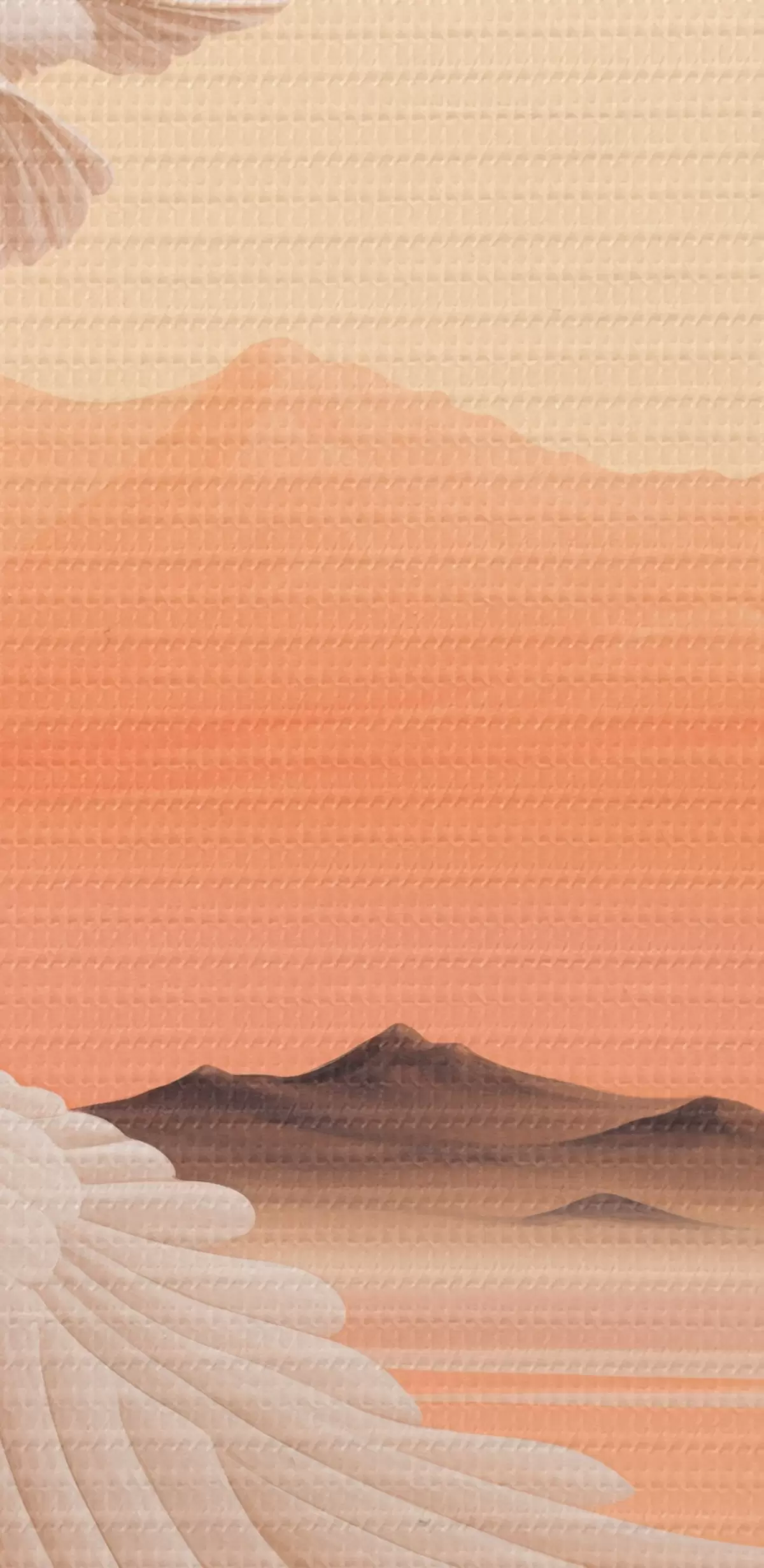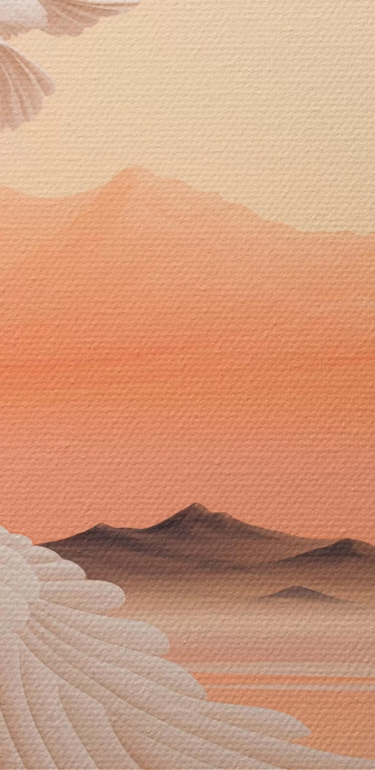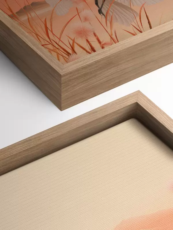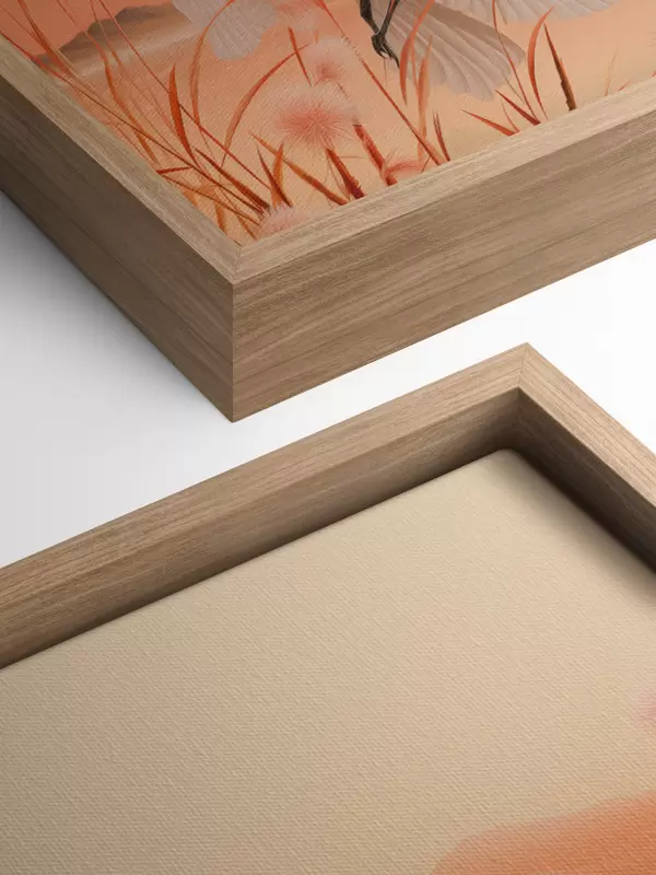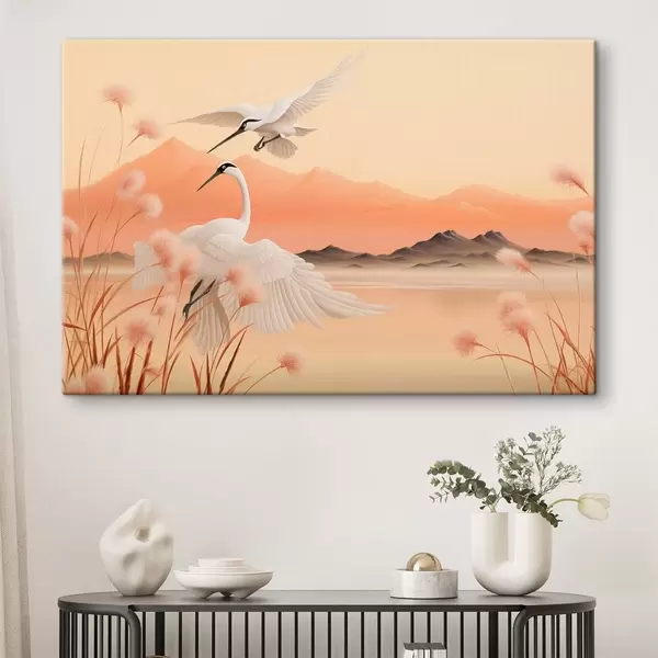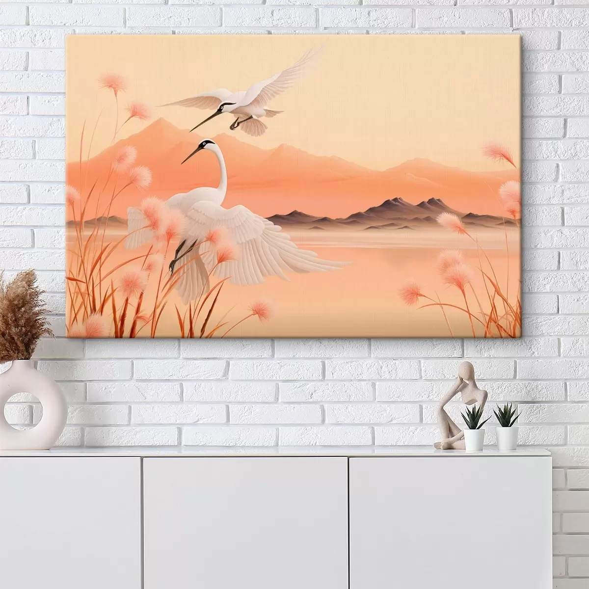 Peinture Grues blanches avec roseaux roses au premier plan, montagnes et lac à l'arrière-plan, lumière orange douce Art. s44925