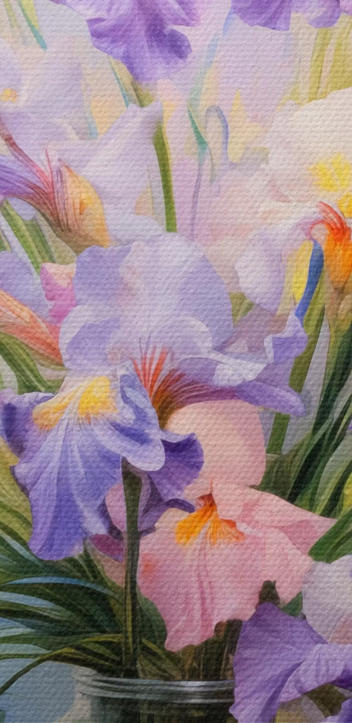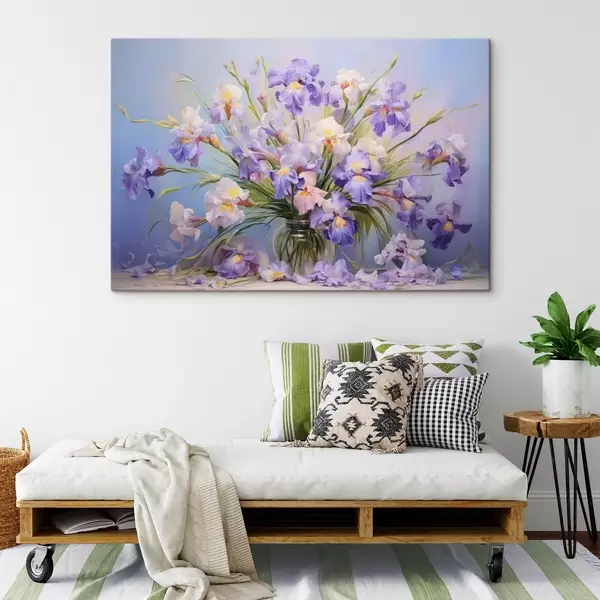 Peinture Un vase avec de nombreux iris pastel, quelques pétales éparpillés sur la table, fond pastel doux avec des tons bleus et roses Art. s44933