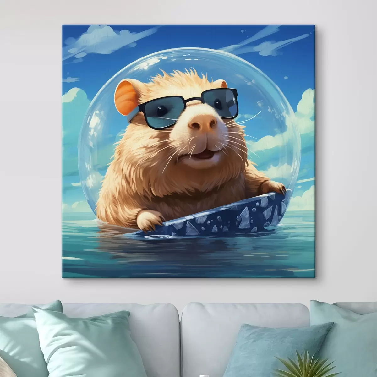 Peinture Capybara joyeux dans une bulle transparente sur l'eau Art. s45029