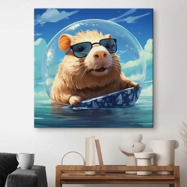 Peinture Capybara joyeux dans une bulle transparente sur l'eau Art. s45029