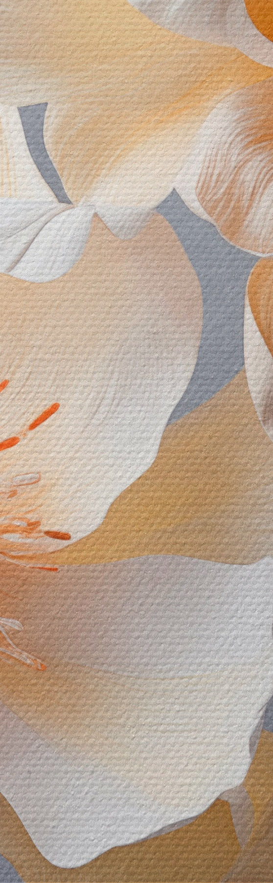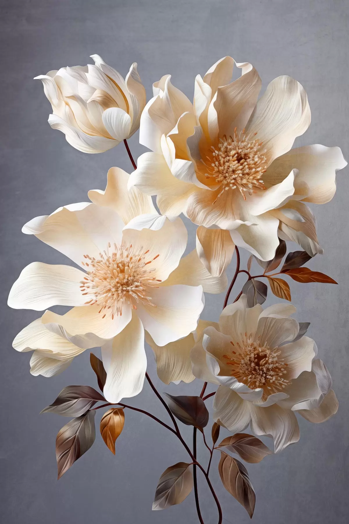 Peinture Fleurs texturées avec pistils orange et feuilles orange sur fond gris, lumière douce, élégant, détaillé, réaliste Art. s45181
