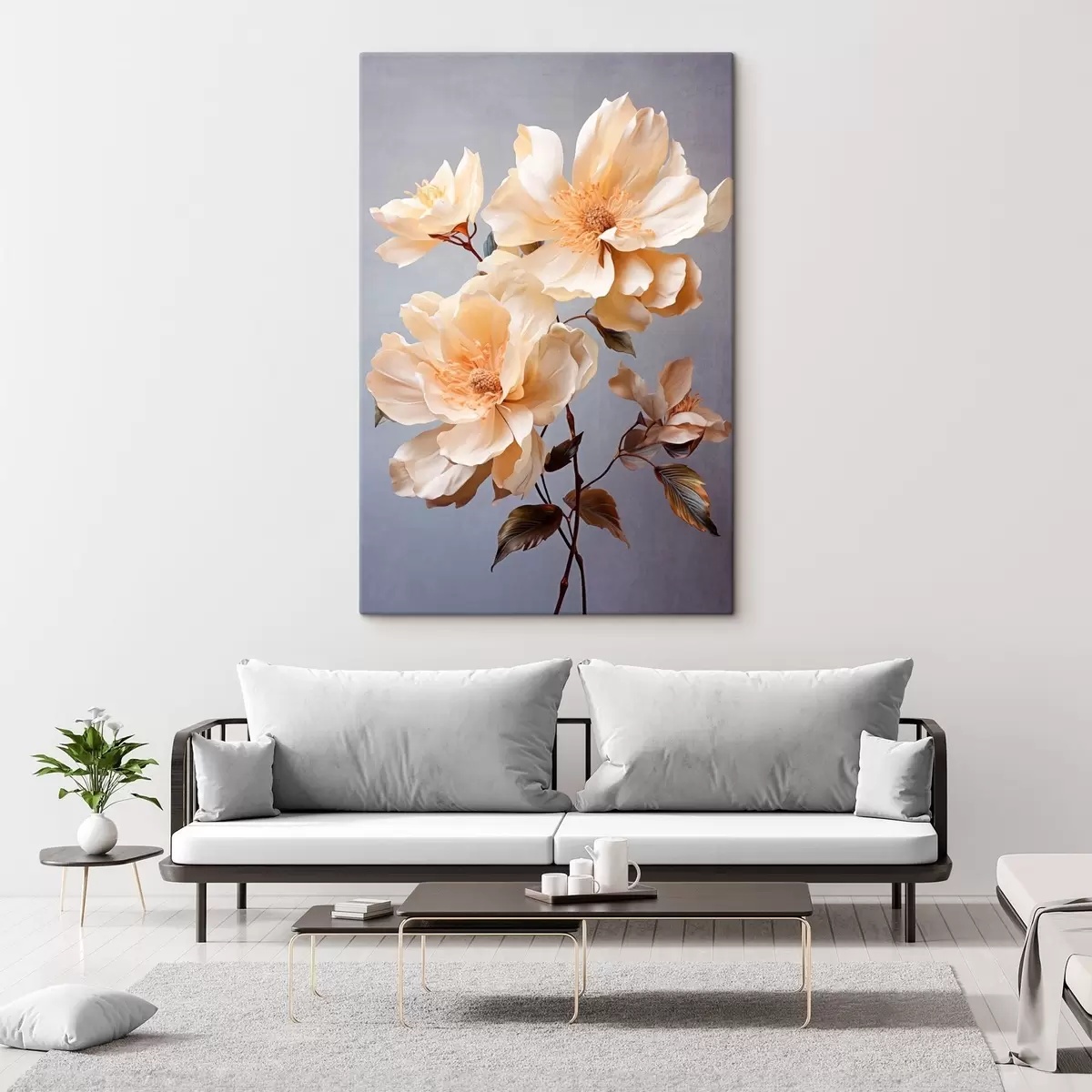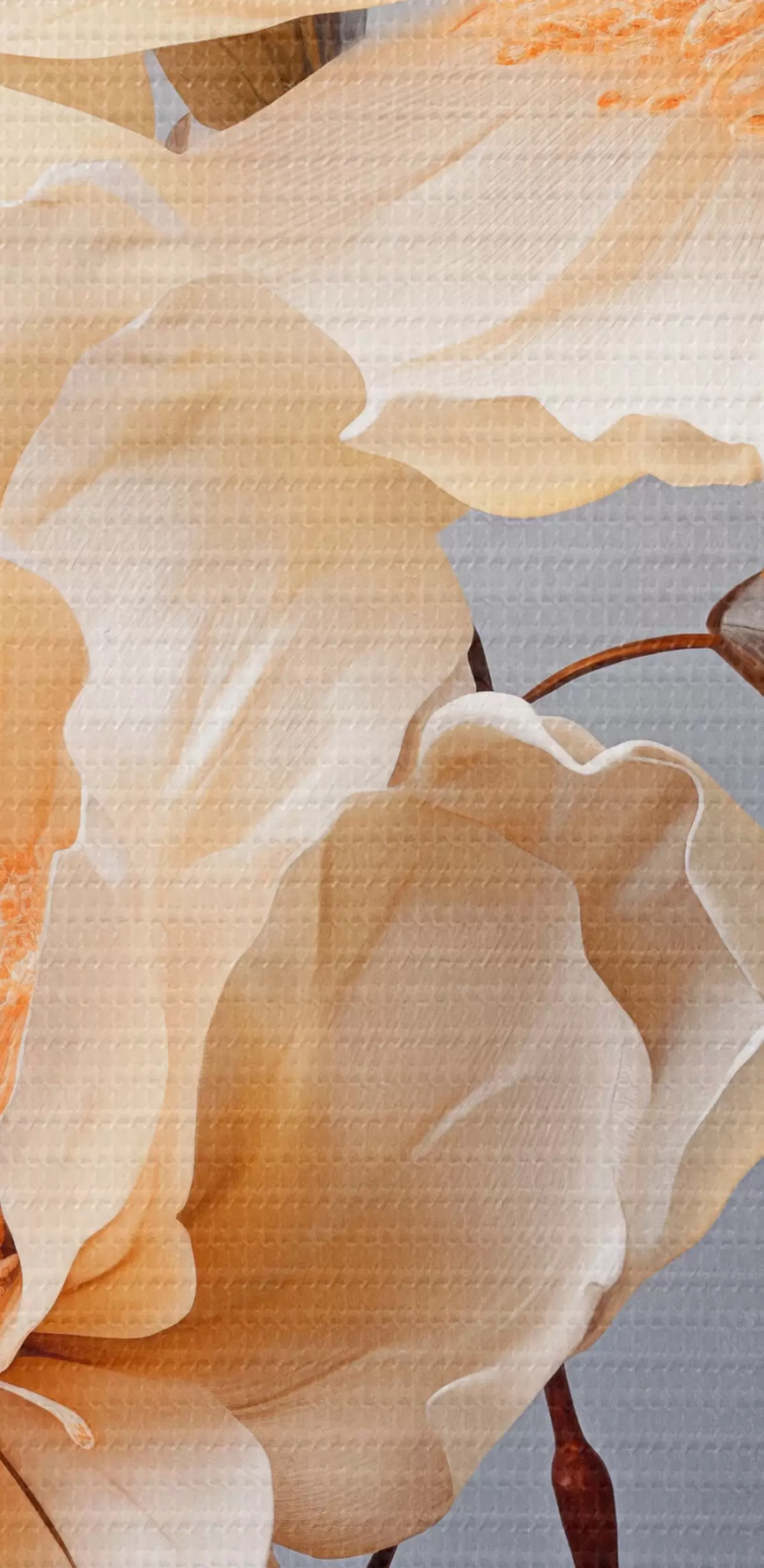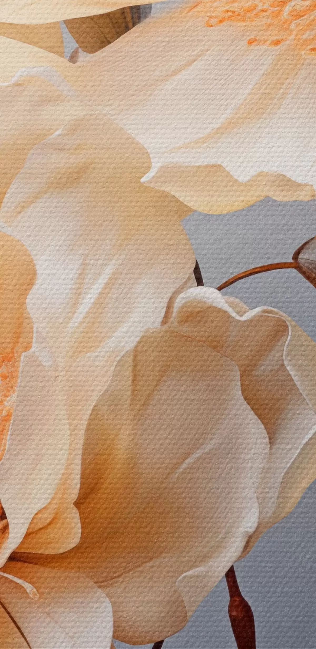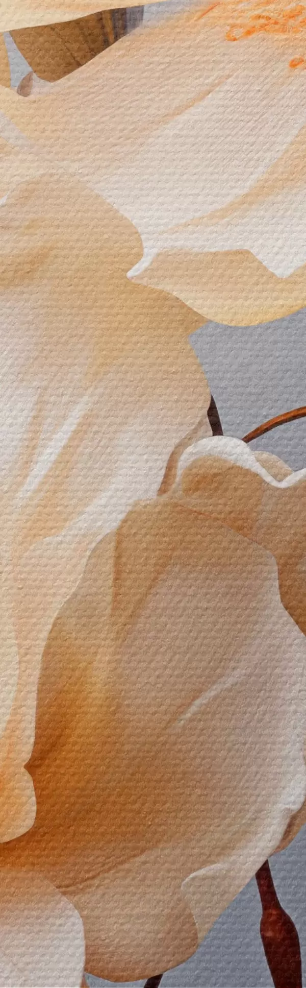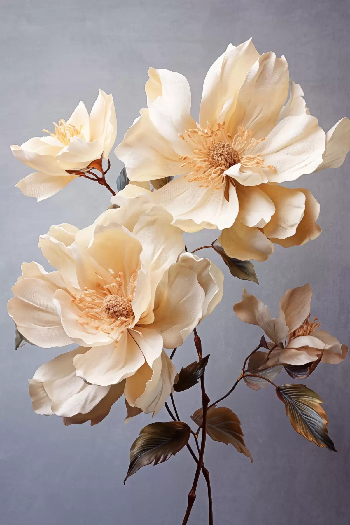 Peinture Fleurs texturées avec pistils orange et feuilles orange sur fond gris, lumière douce, élégant, détaillé, réaliste Art. s45182