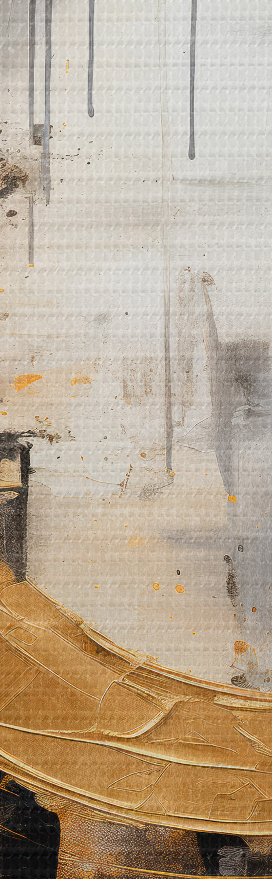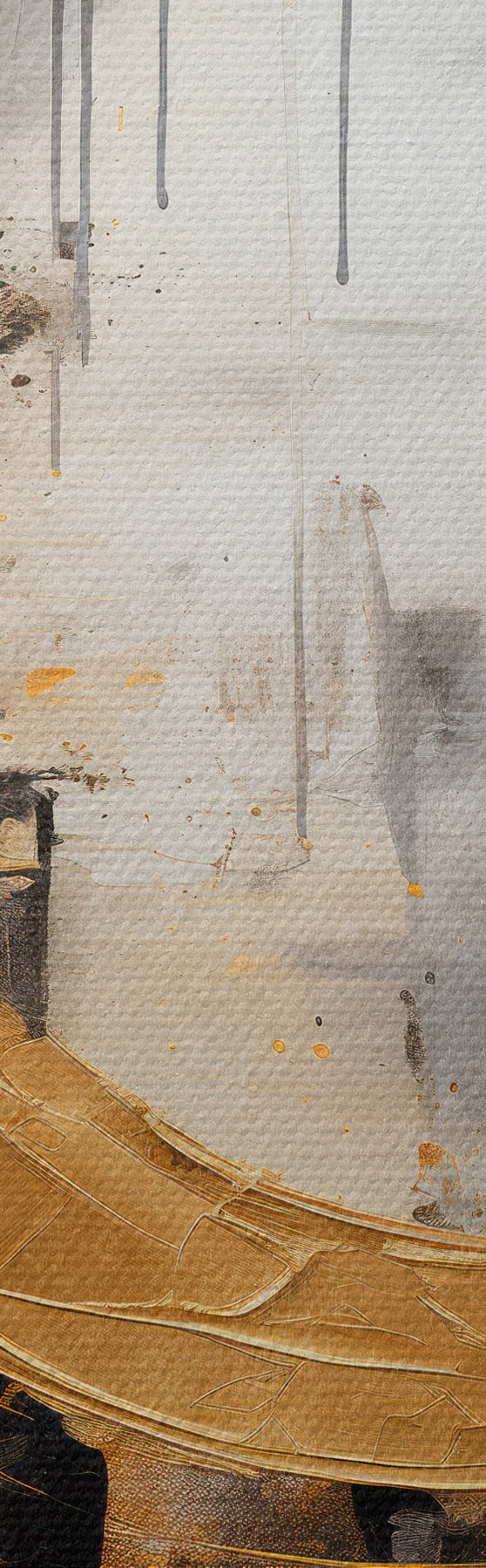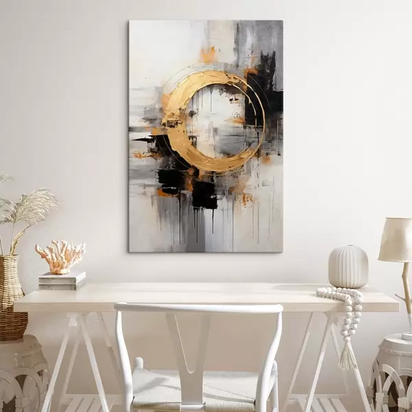 Peintures Peinture abstraite avec des cercles, des lignes noires et jaunes, et un arrière-plan dans les tons gris et blancs s45186