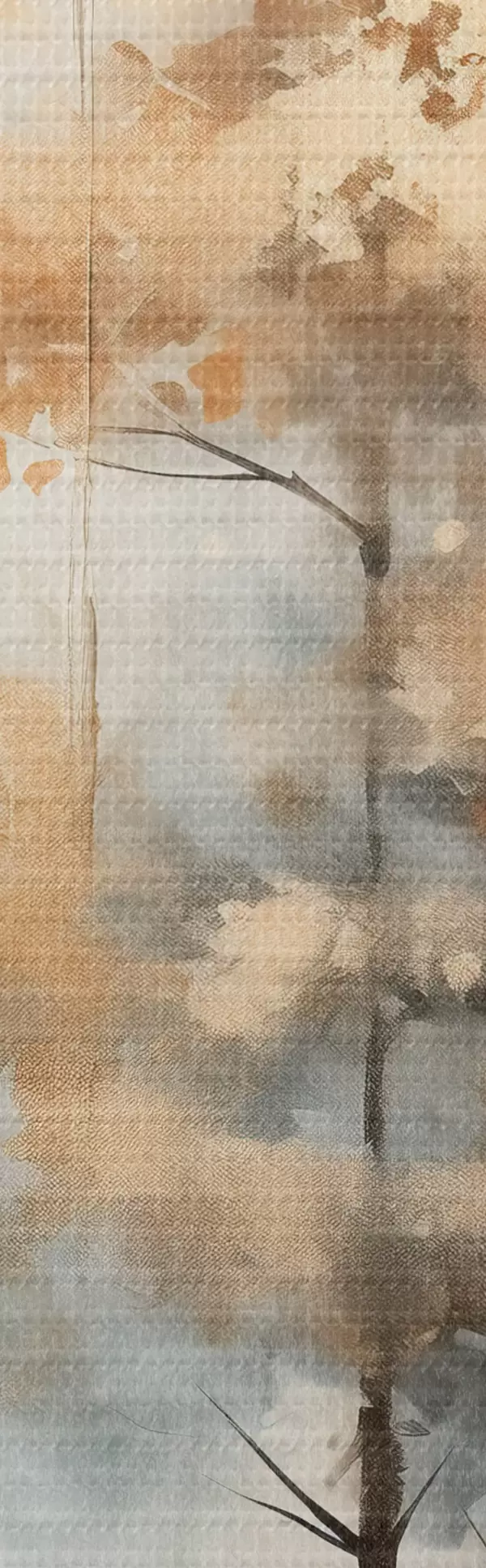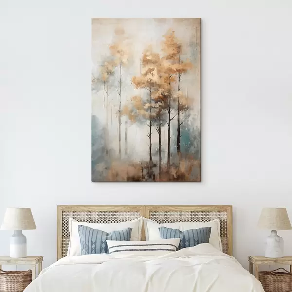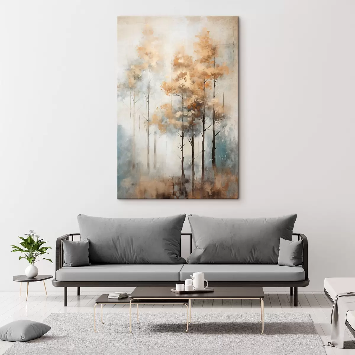 Peinture Grands arbres texturés avec des feuilles jaunes dans une forêt, l'arrière-plan est un mélange de tons bleus et bruns doux Art. s45187