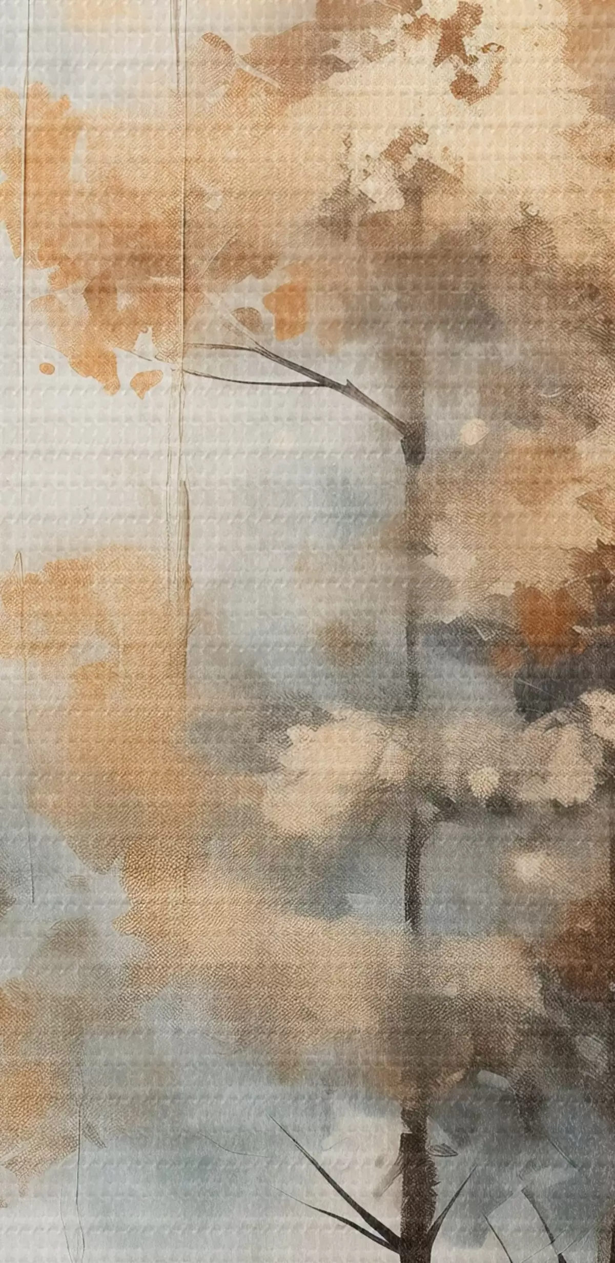 Peintures Grands arbres texturés avec des feuilles jaunes dans une forêt, l'arrière-plan est un mélange de tons bleus et bruns doux s45187