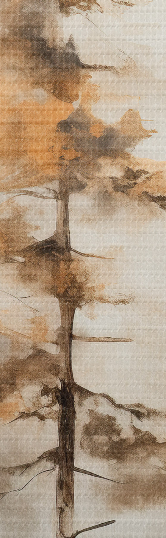 Peinture Grands arbres texturés avec des feuilles jaunes dans une forêt, l'arrière-plan est un mélange de tons bleus et bruns doux Art. s45188