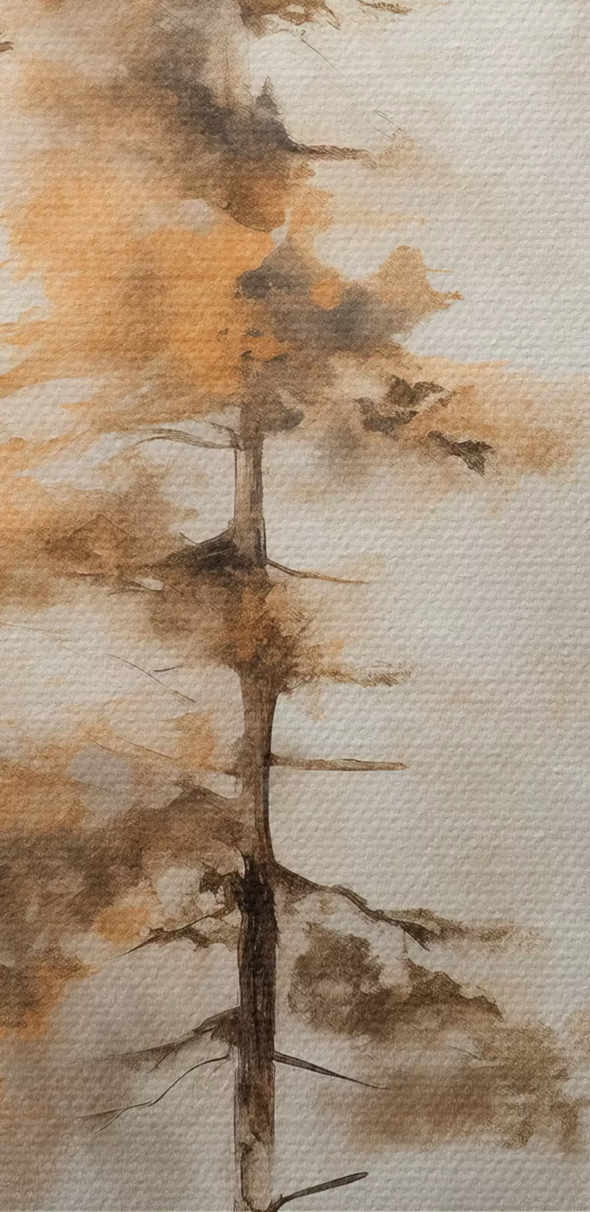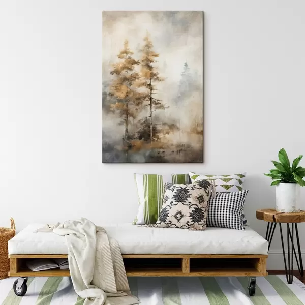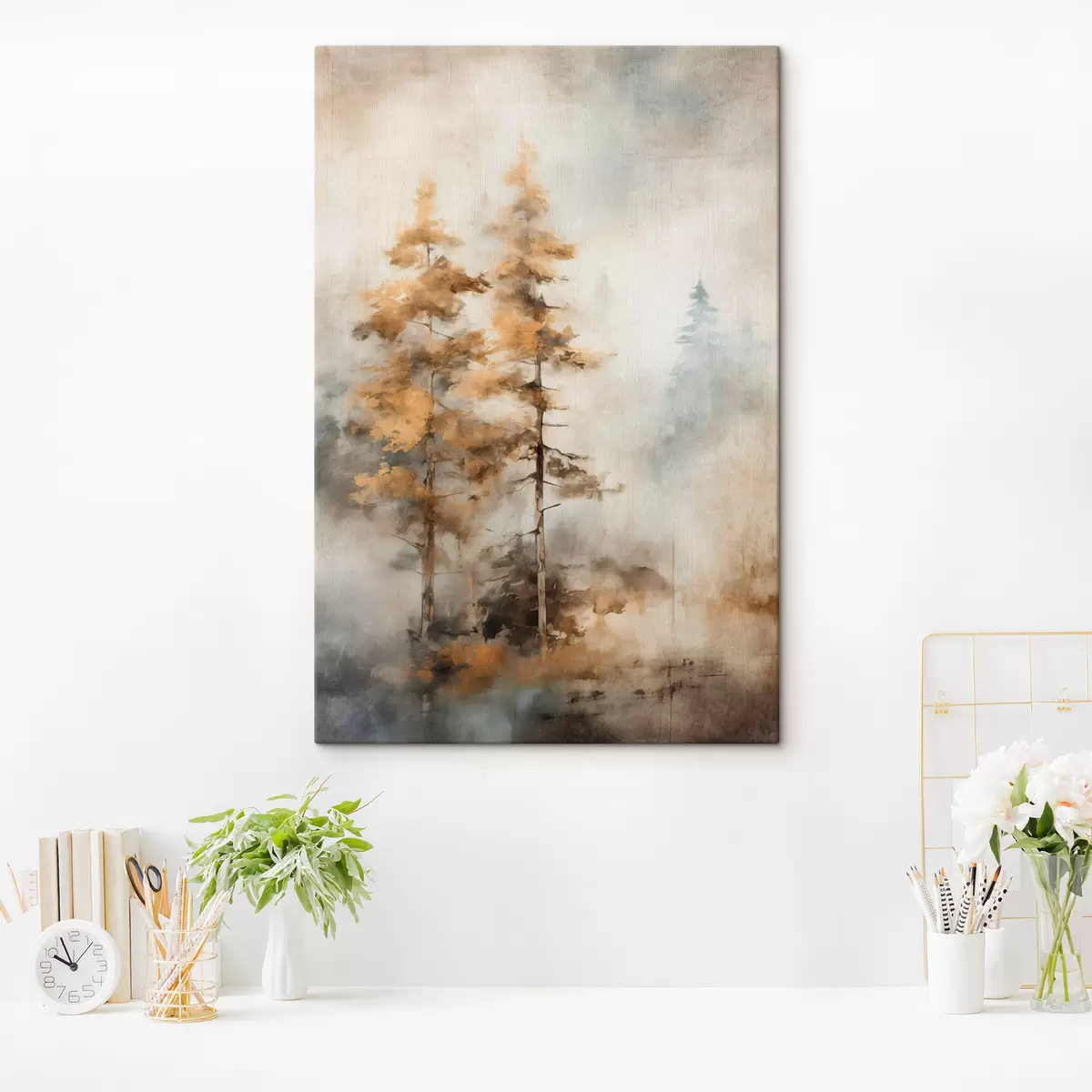 Peinture Grands arbres texturés avec des feuilles jaunes dans une forêt, l'arrière-plan est un mélange de tons bleus et bruns doux Art. s45188