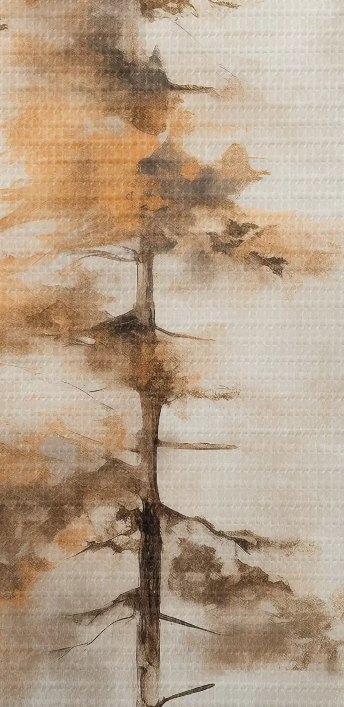 Peintures Grands arbres texturés avec des feuilles jaunes dans une forêt, l'arrière-plan est un mélange de tons bleus et bruns doux s45188