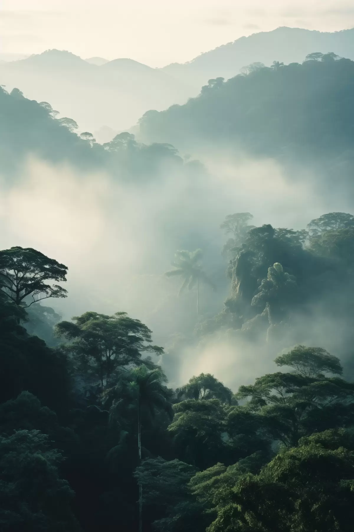 Peintures Forêt tropicale avec des arbres verdoyants et une épaisse couche de brume, créant un environnement atmosphérique s45189