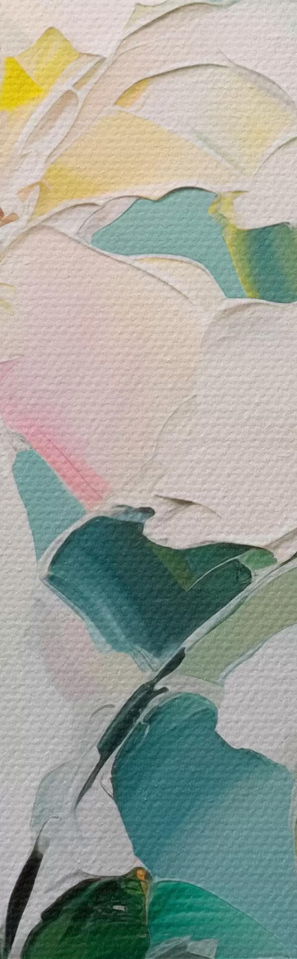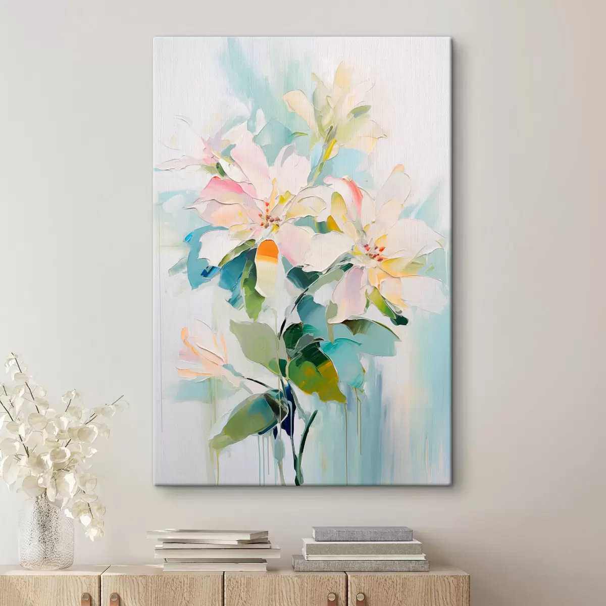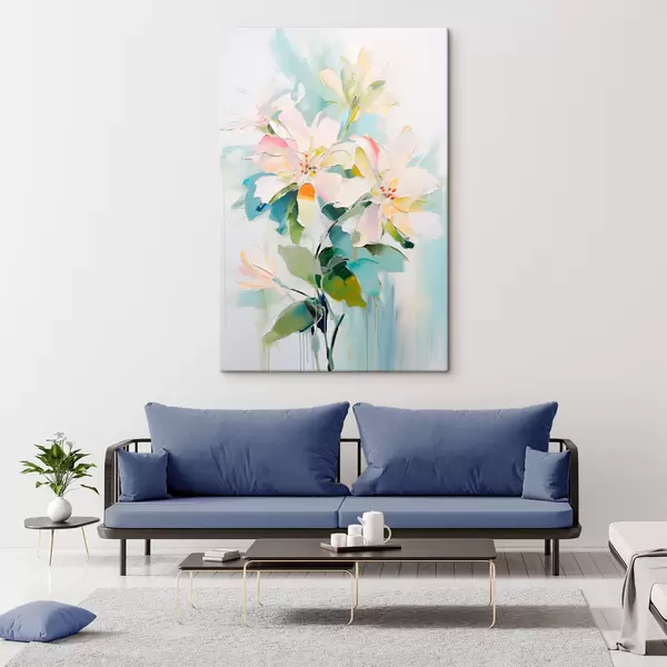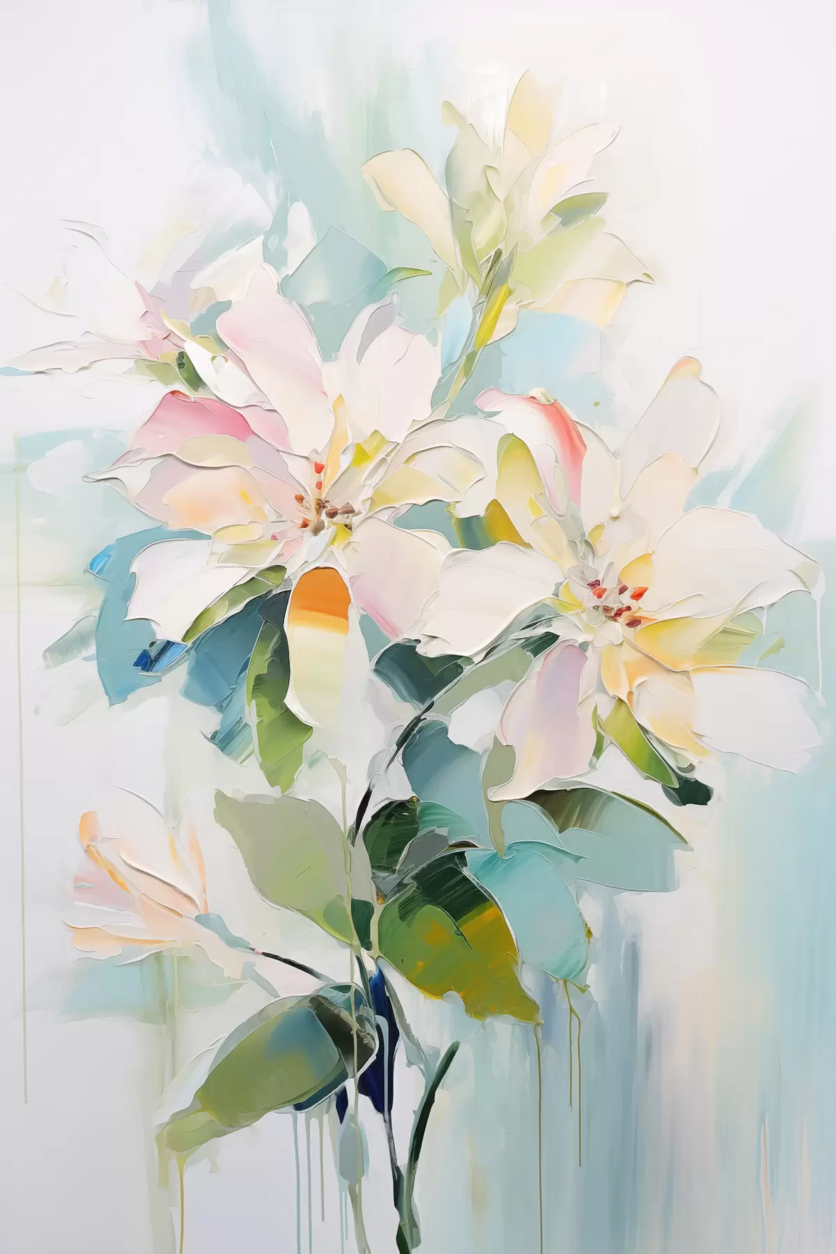 Peinture Fleurs avec accents colorés, feuilles vertes, coups de pinceau doux imitation peinture à l'huile, fond bleu clair Art. s45549
