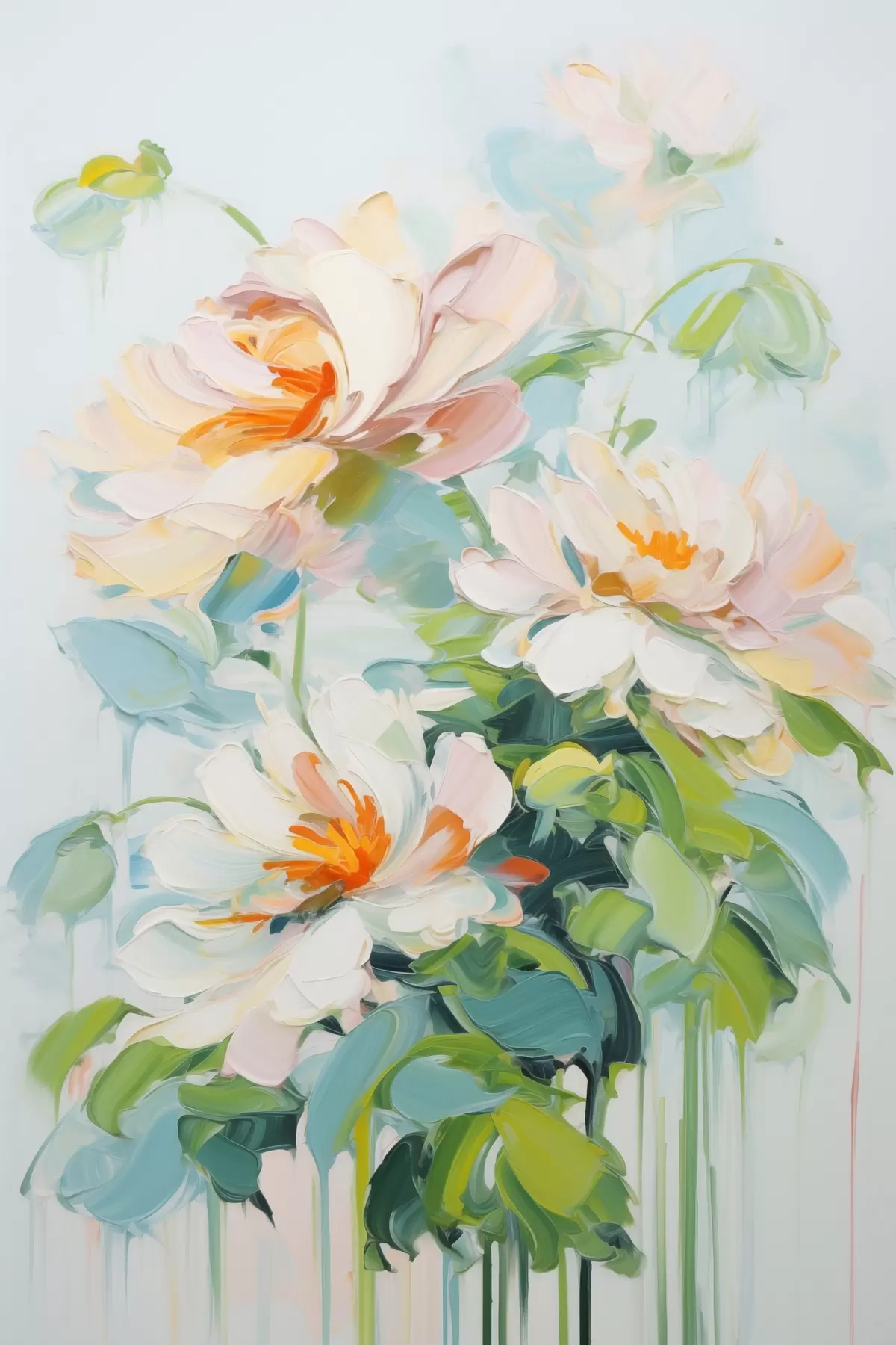 Peintures Fleurs de pêche blanches et pastel, feuilles vertes, coups de pinceau doux imitation peinture à l'huile, fond bleu clair s45550