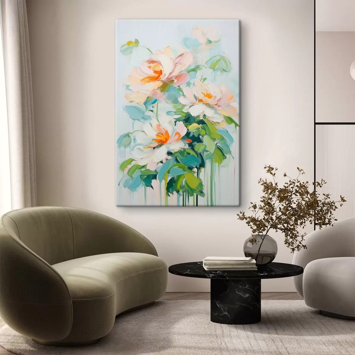 Peinture Fleurs de pêche blanches et pastel, feuilles vertes, coups de pinceau doux imitation peinture à l'huile, fond bleu clair Art. s45550