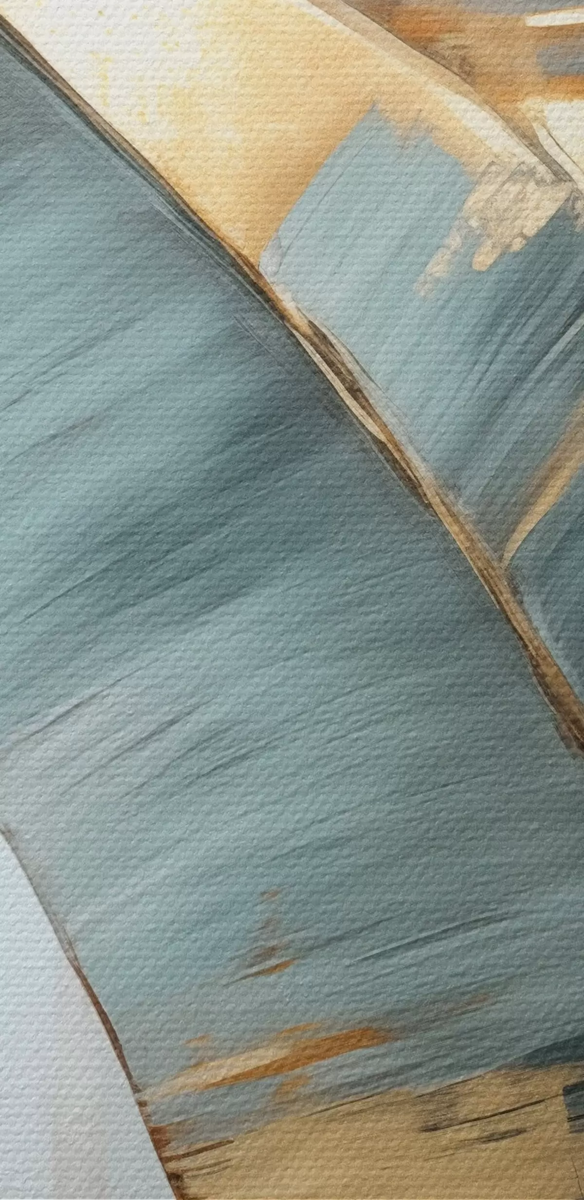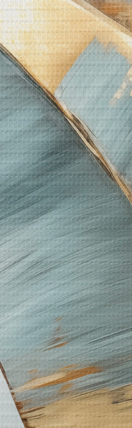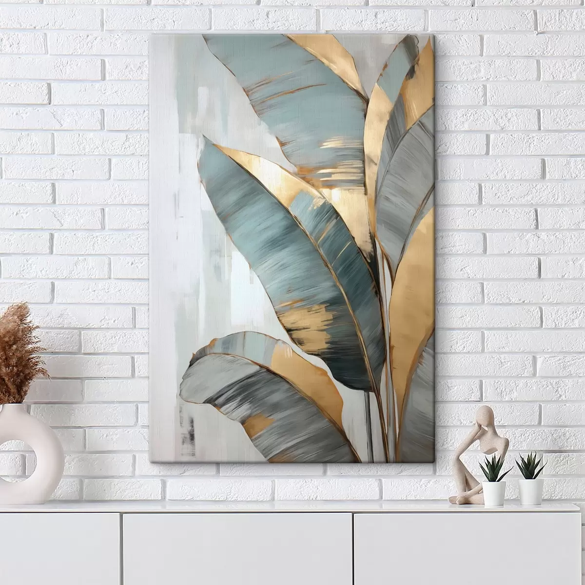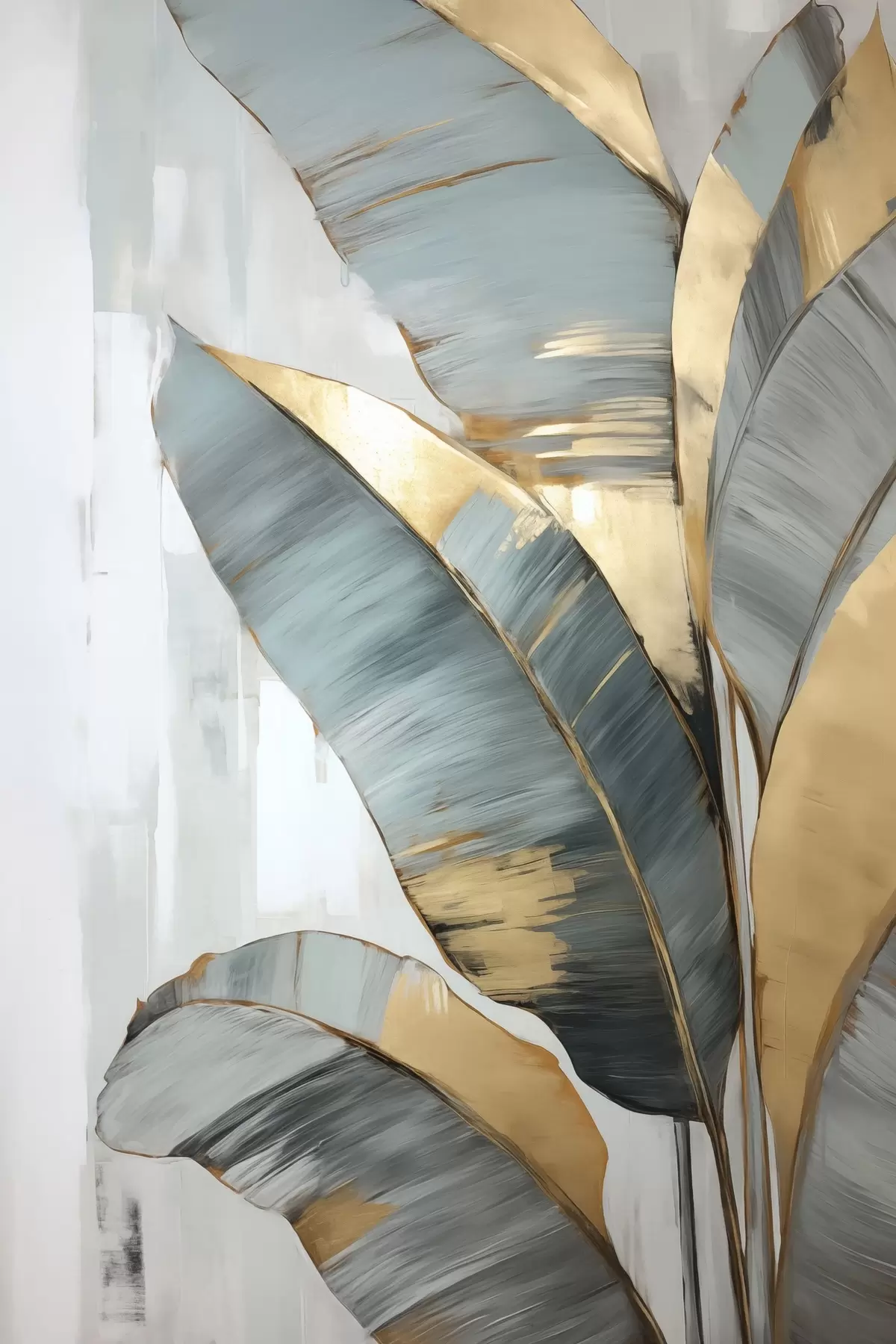 Peintures Un ensemble de feuilles de bananier bleues, grises et jaunes avec des coups de pinceau visibles, sur un fond blanc abstrait s45551