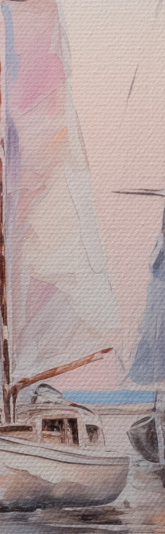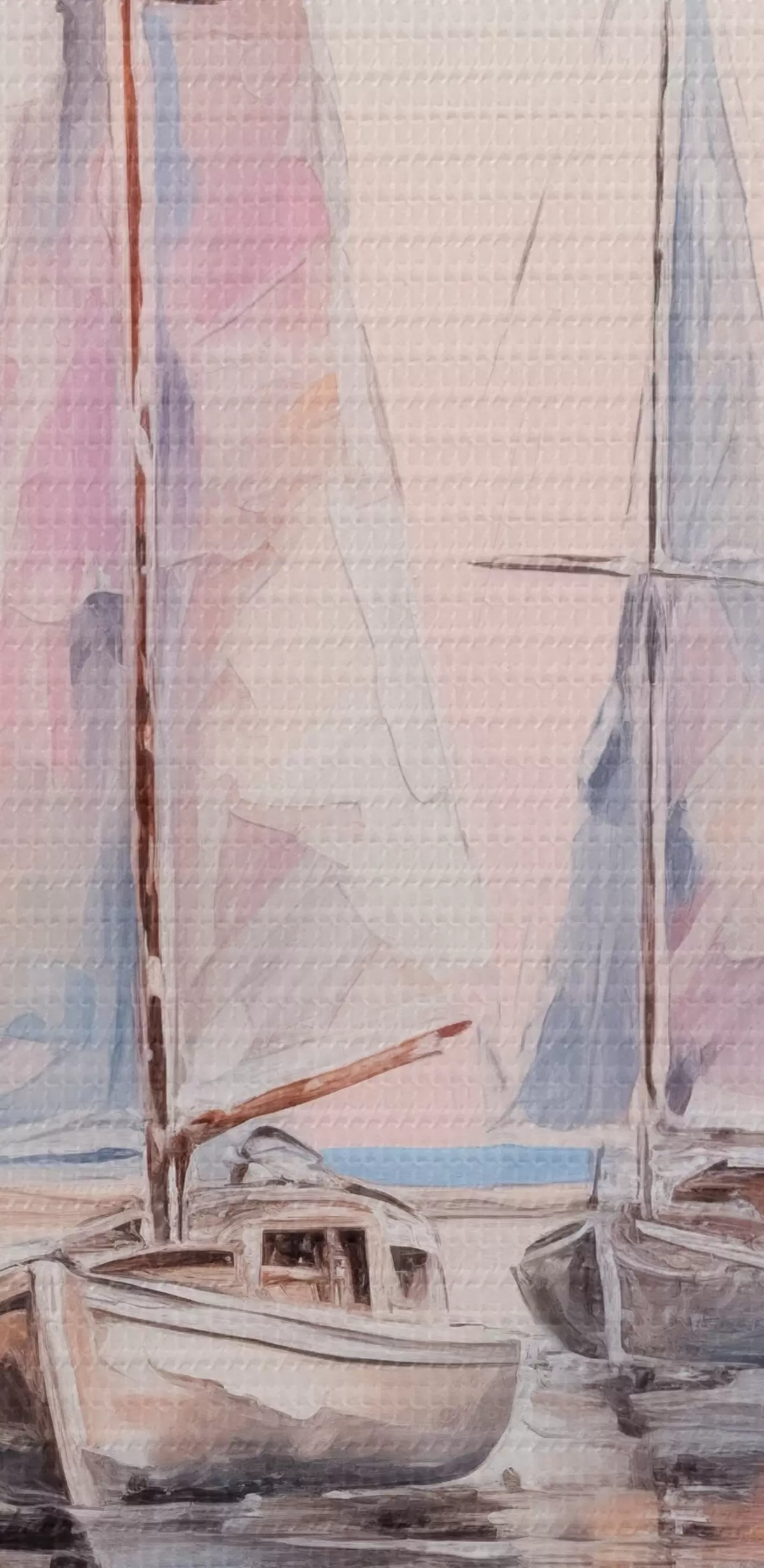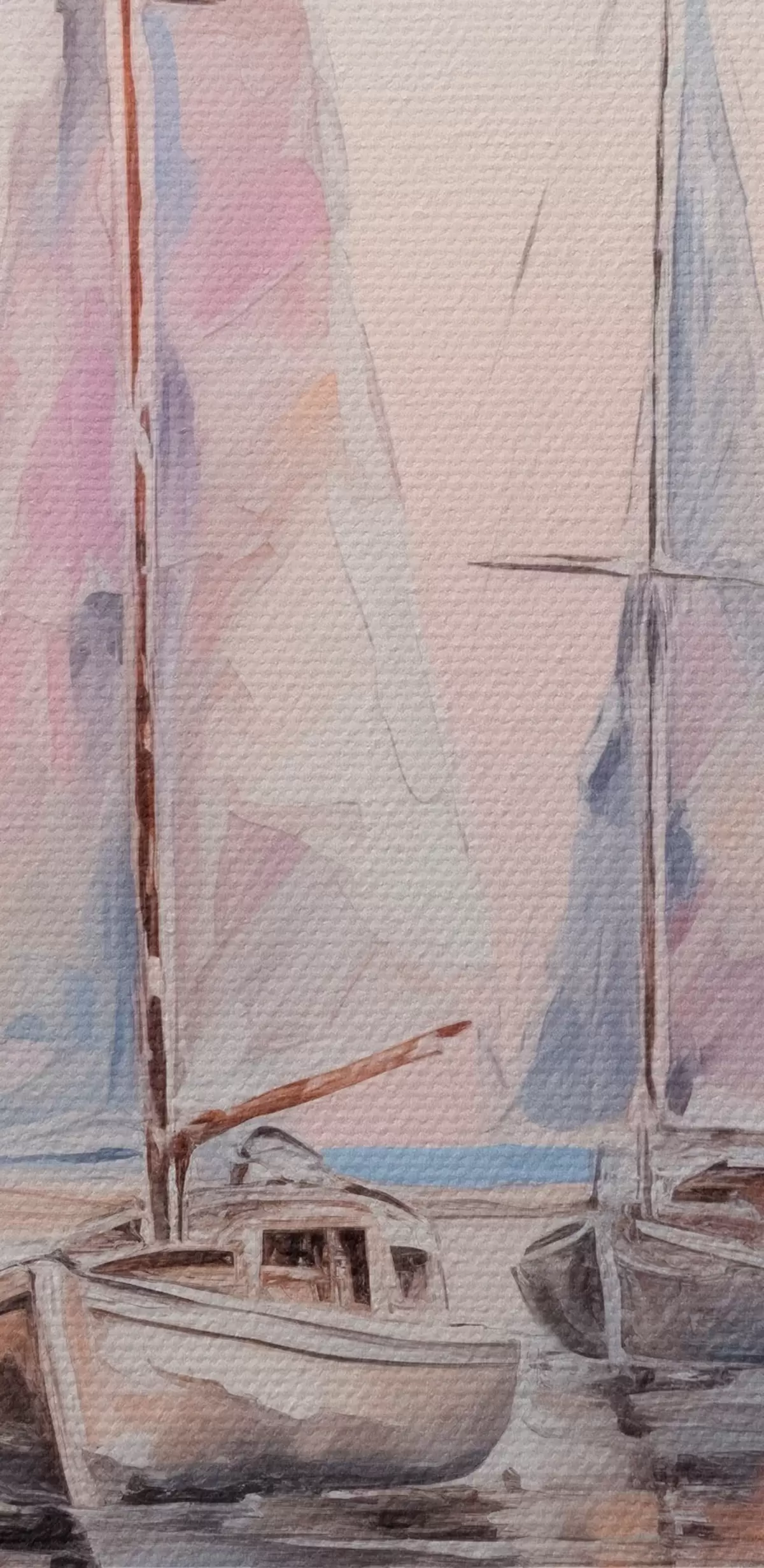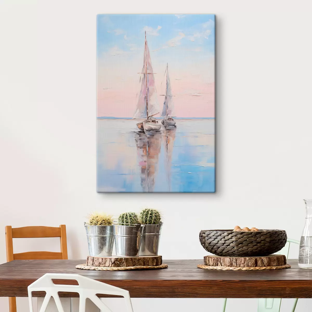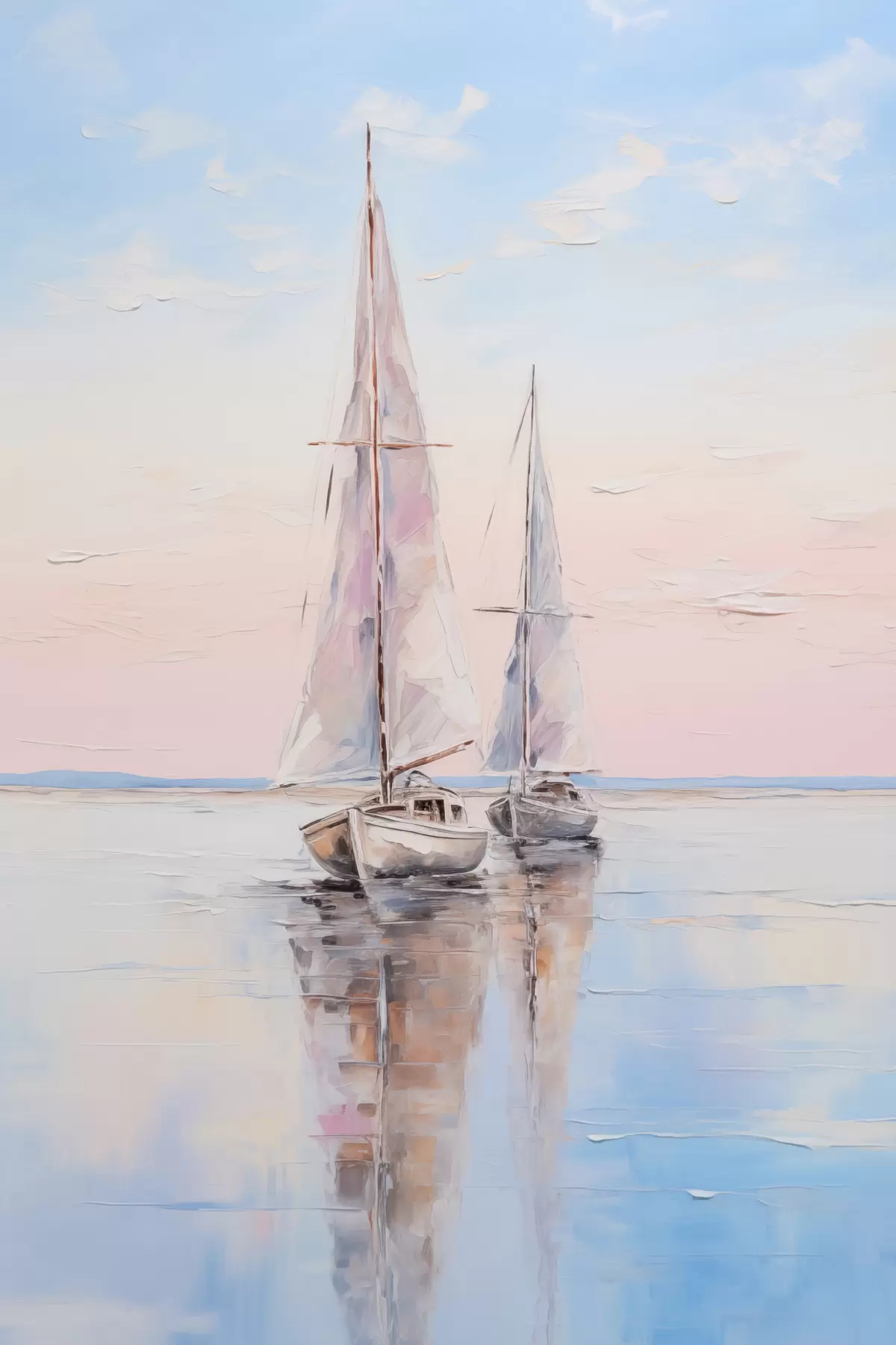 Peinture Voiliers aux voiles roses flottant sur une mer calme, reflets des bateaux dans l'eau, couleurs douces et pastel Art. s45558