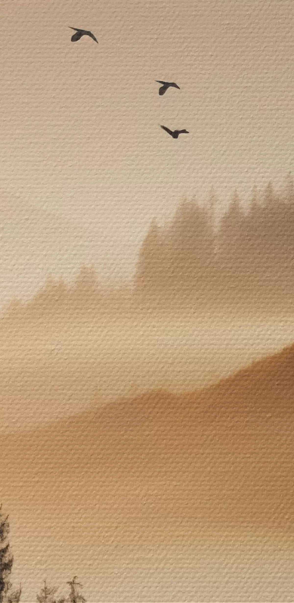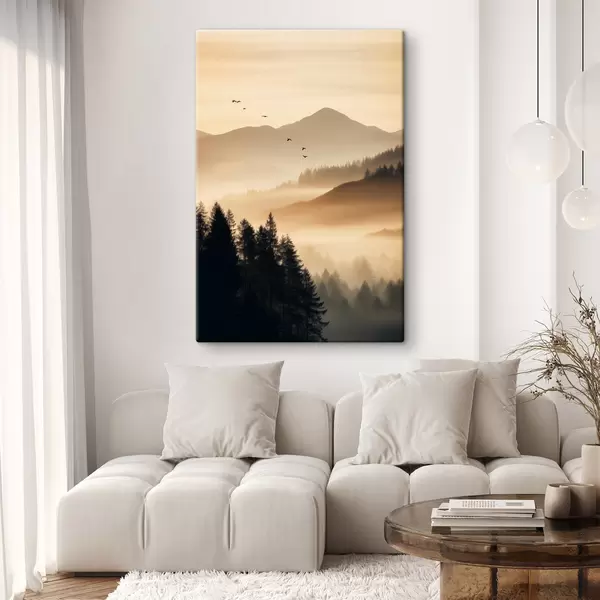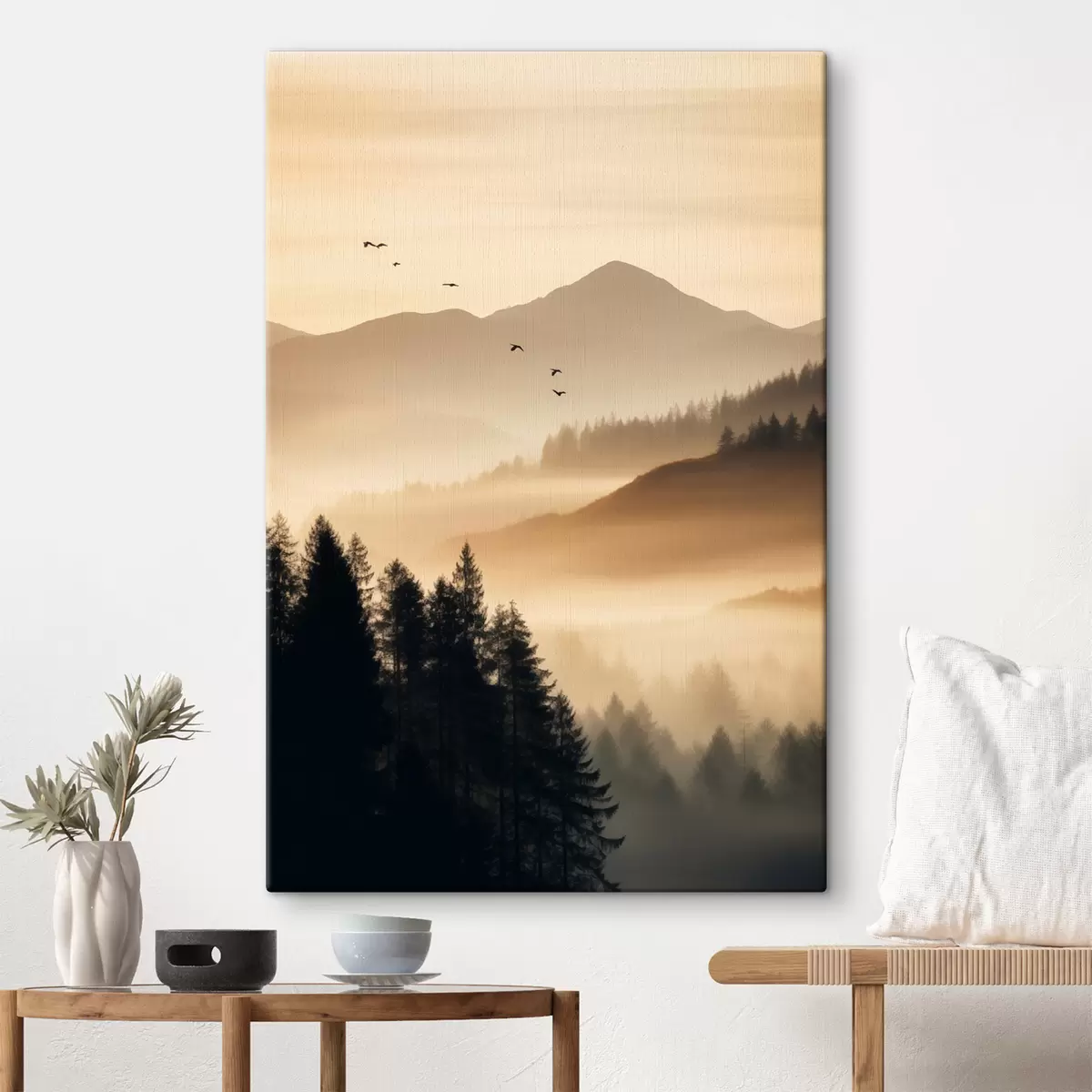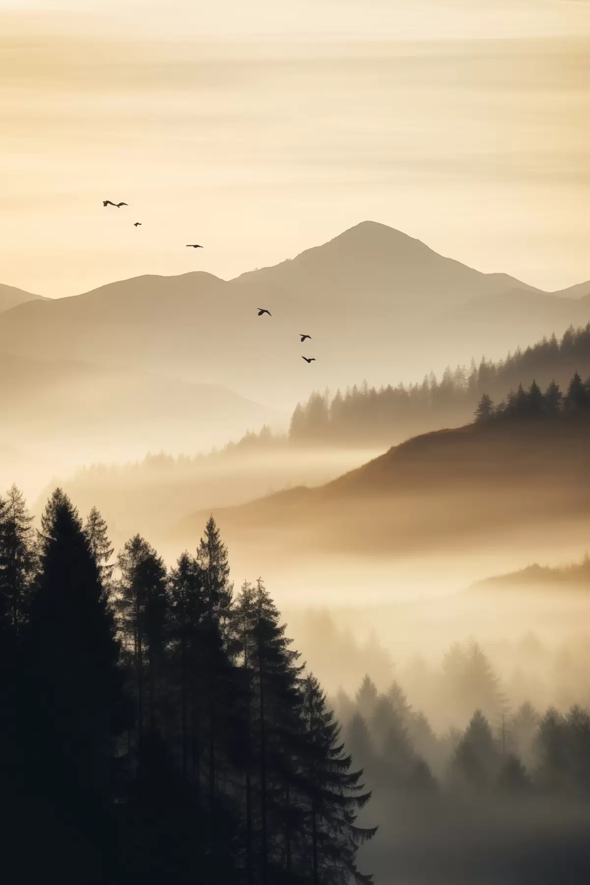 Peintures Un paysage de montagne avec une forêt et des oiseaux volant dans le ciel, le tout recouvert d'une épaisse couche de brouillard au lever du soleil s45563