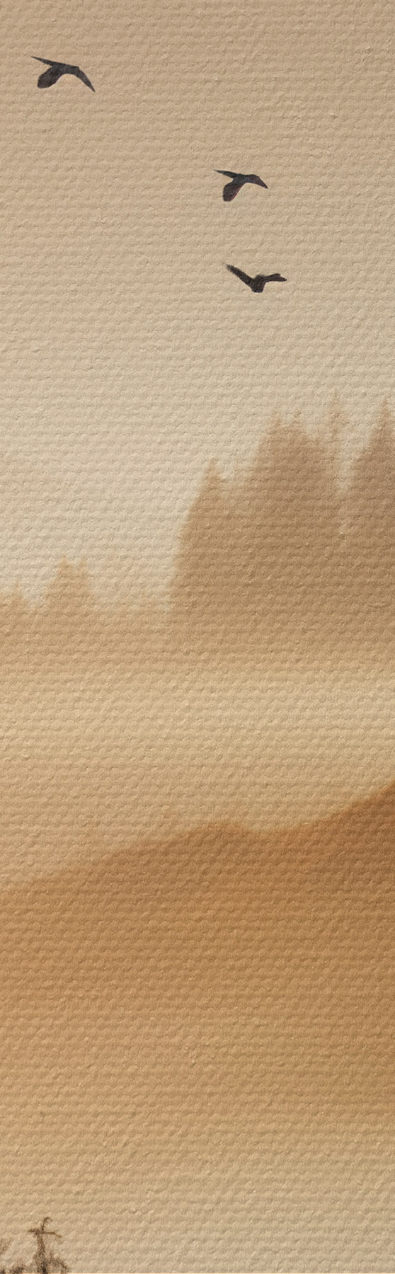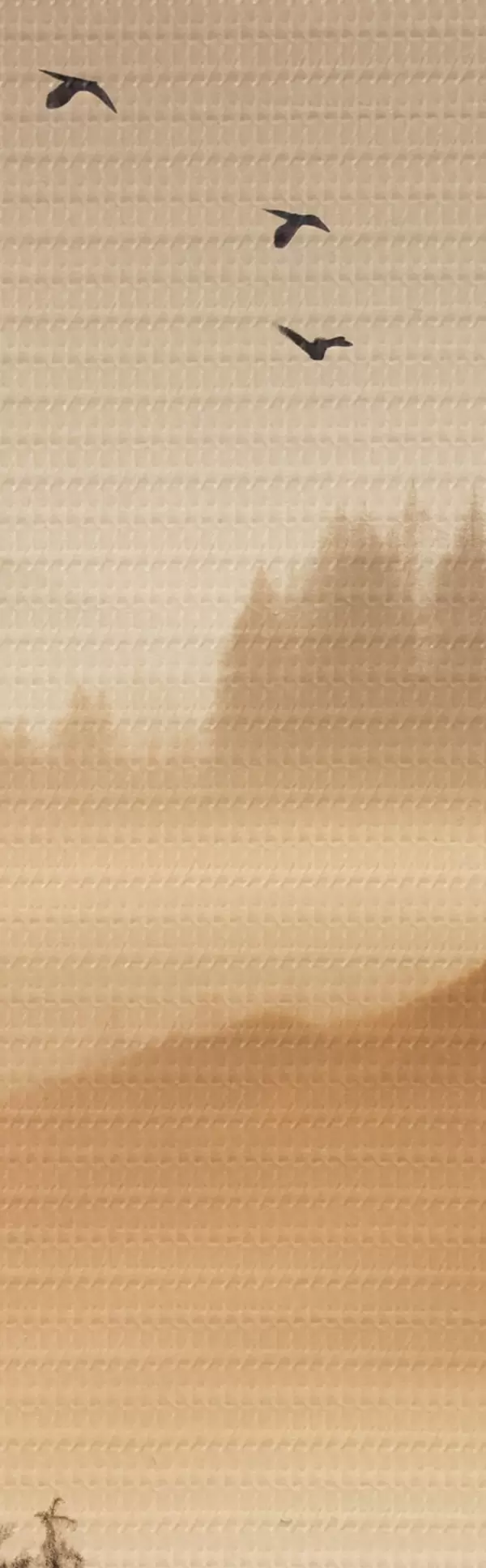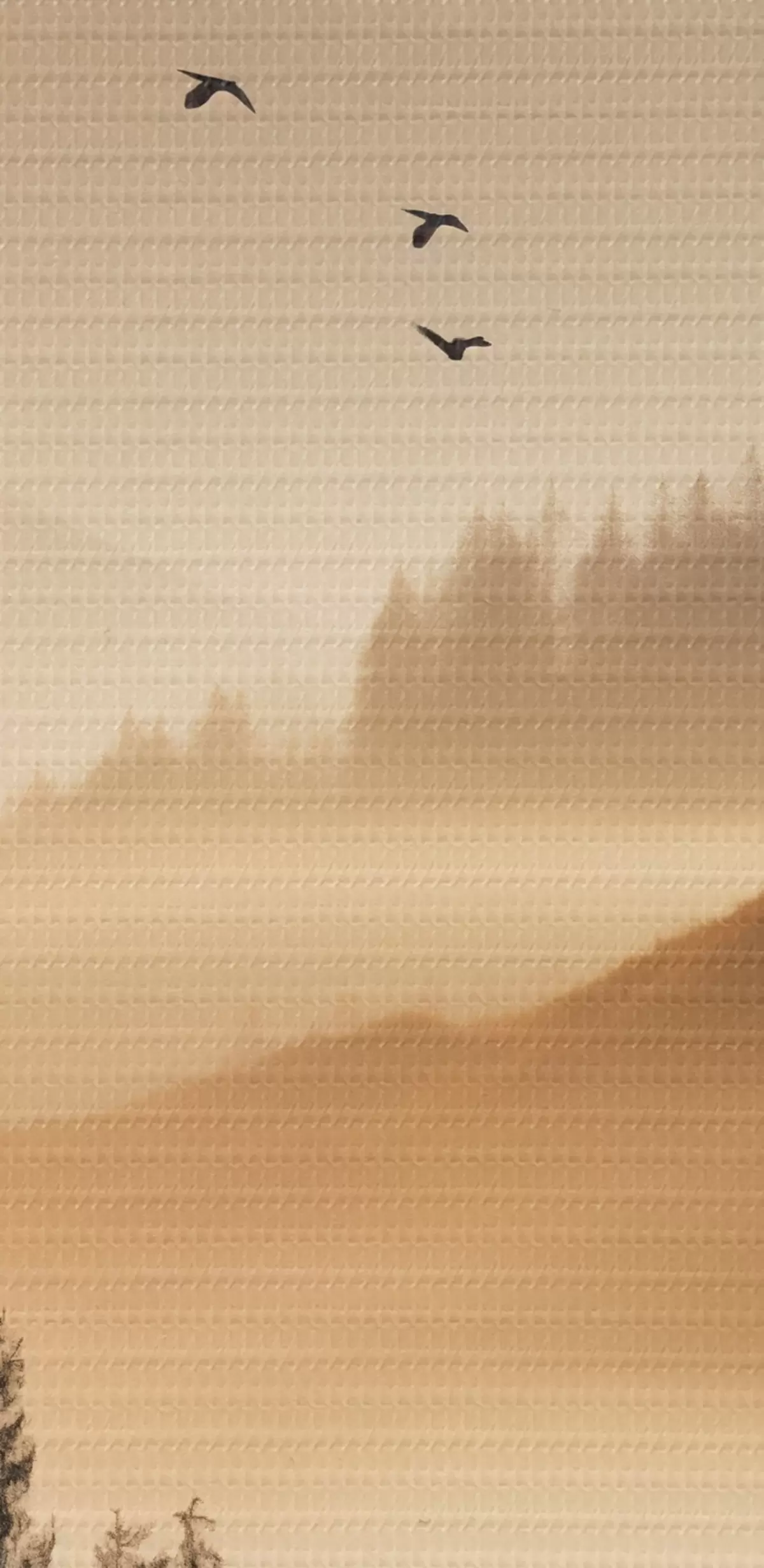 Peinture Un paysage de montagne avec une forêt et des oiseaux volant dans le ciel, le tout recouvert d'une épaisse couche de brouillard au lever du soleil Art. s45563