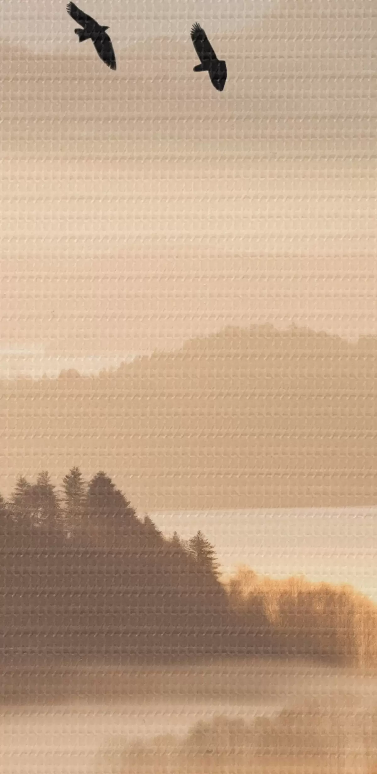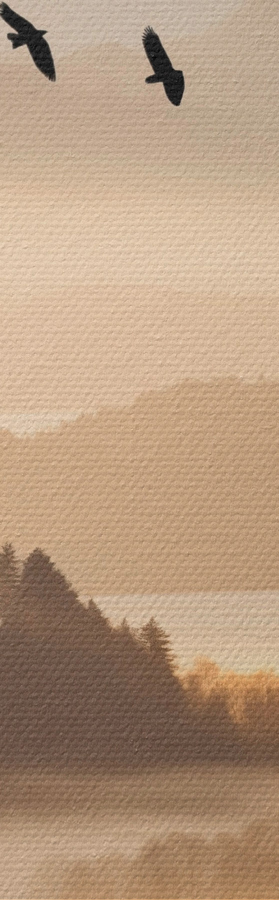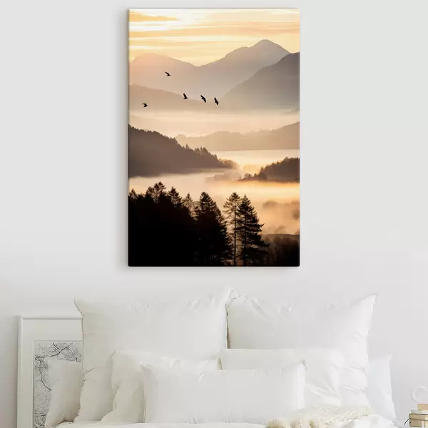 Peintures Un paysage de montagne avec une forêt et des oiseaux volant dans le ciel, le tout recouvert d'une épaisse couche de brouillard au lever du soleil s45564