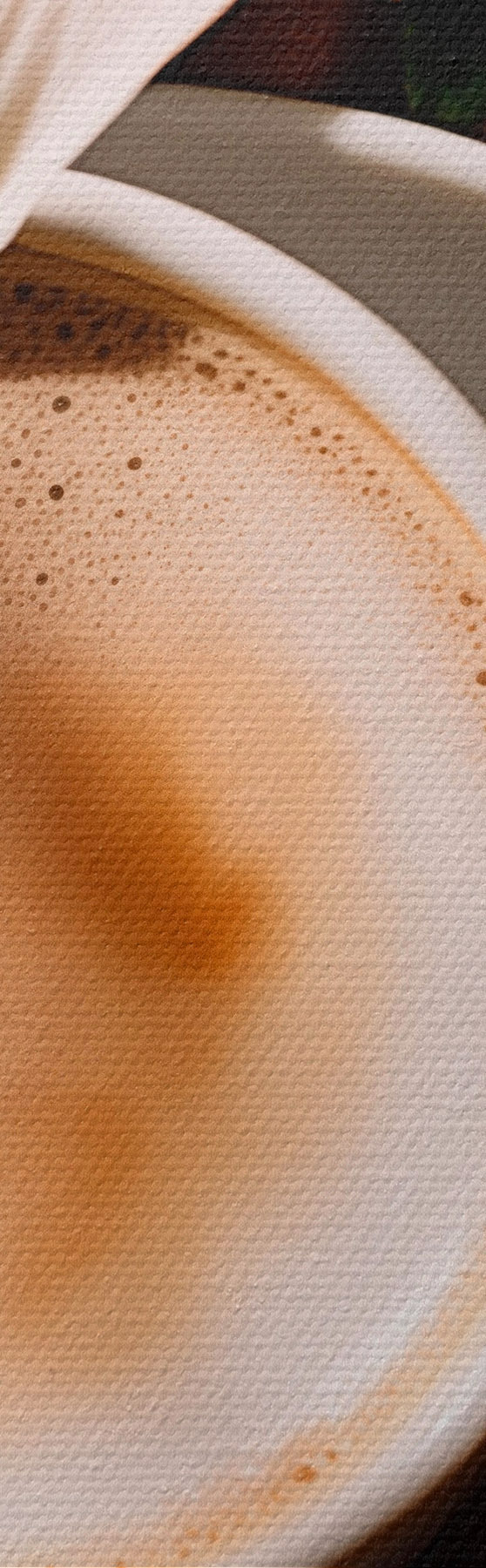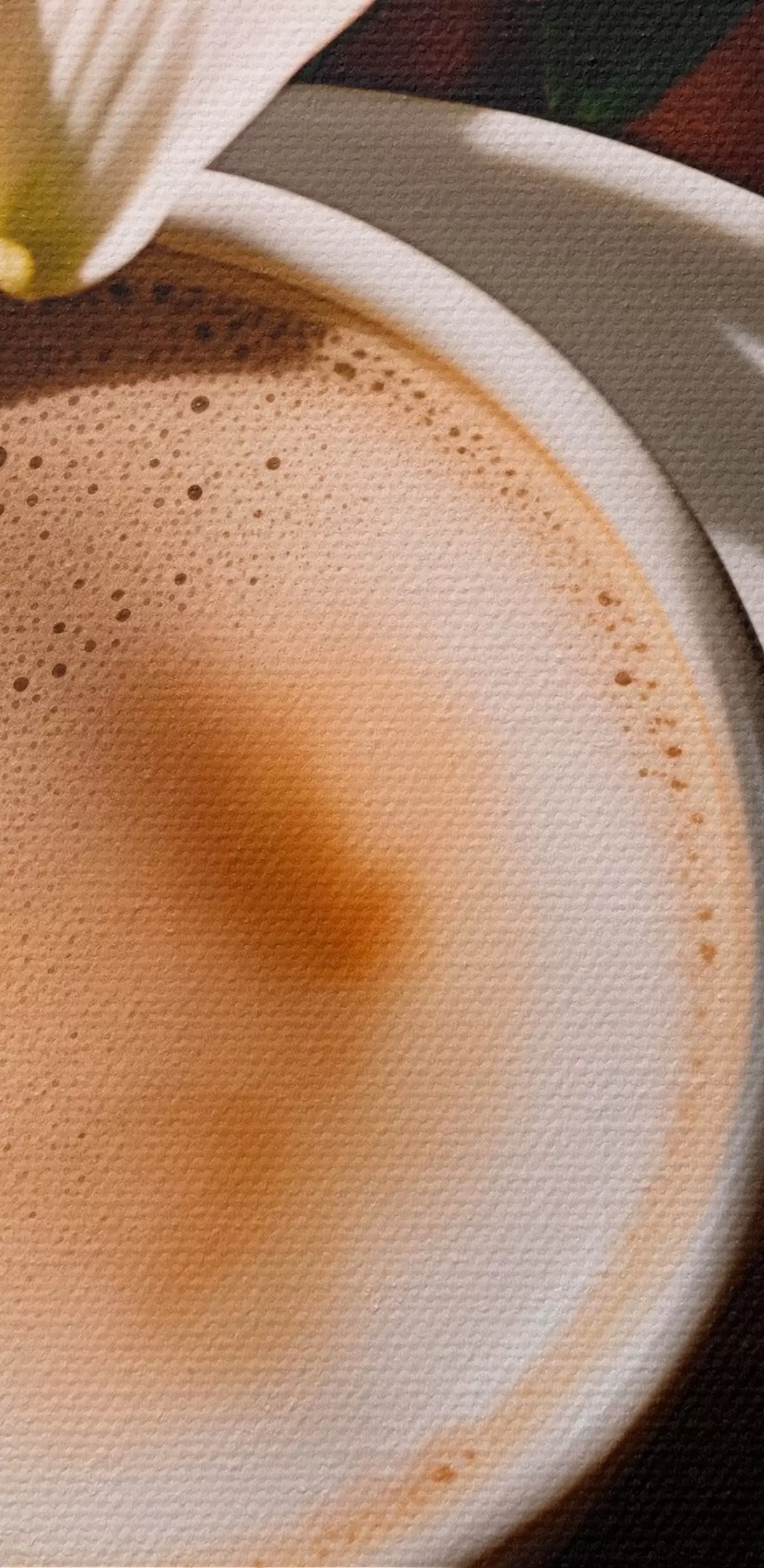 Peinture Une tasse de café avec de la mousse sur une assiette blanche, quelques fleurs en arrière-plan, avec la lumière du soleil Art. s45569