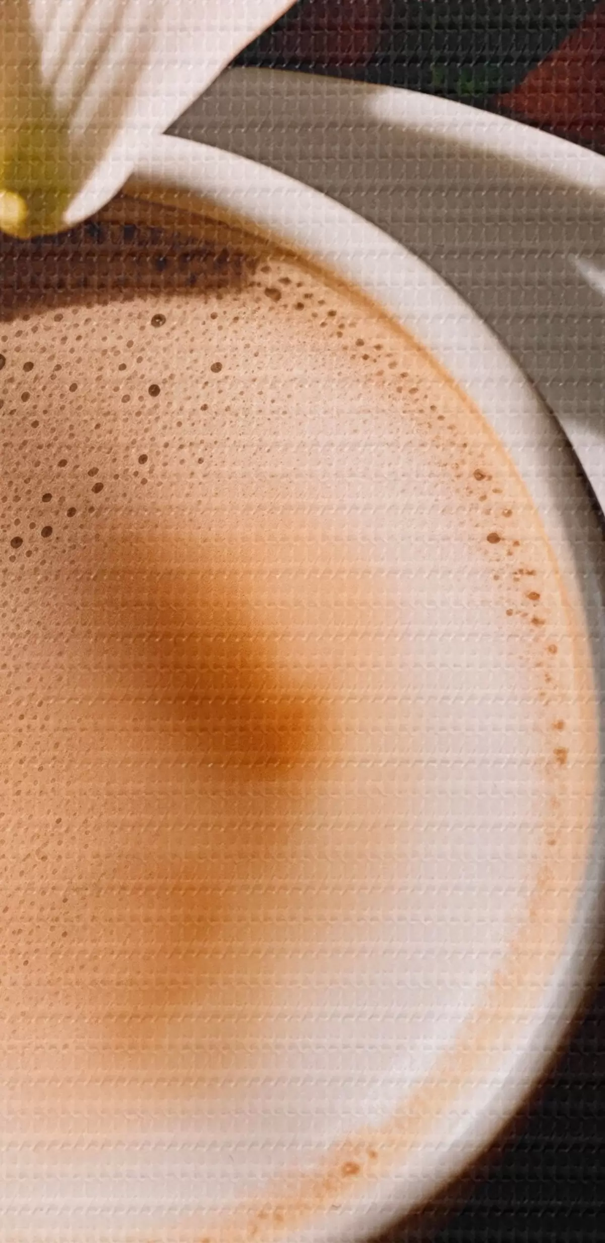 Peintures Une tasse de café avec de la mousse sur une assiette blanche, quelques fleurs en arrière-plan, avec la lumière du soleil s45569