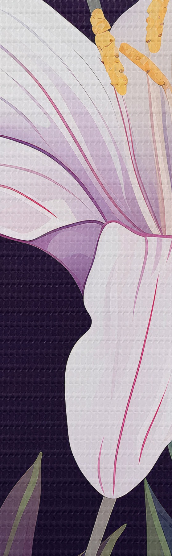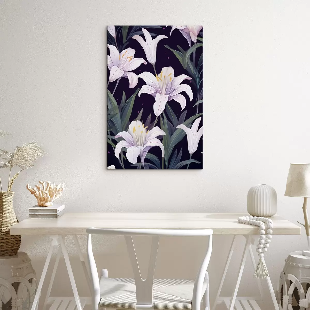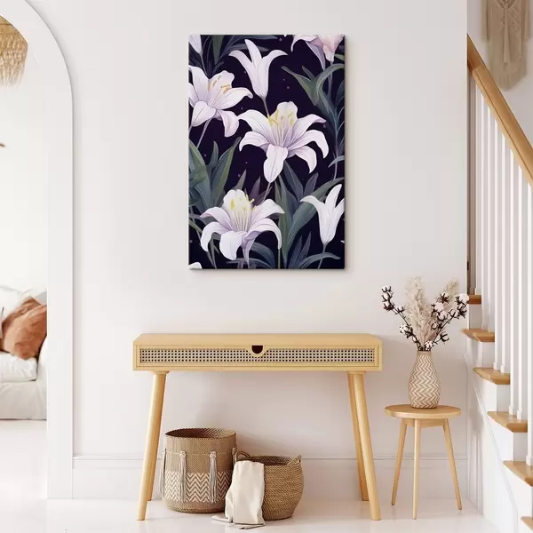 Peinture Lys délicats sur un fond sombre avec des feuilles vertes Art. s45697