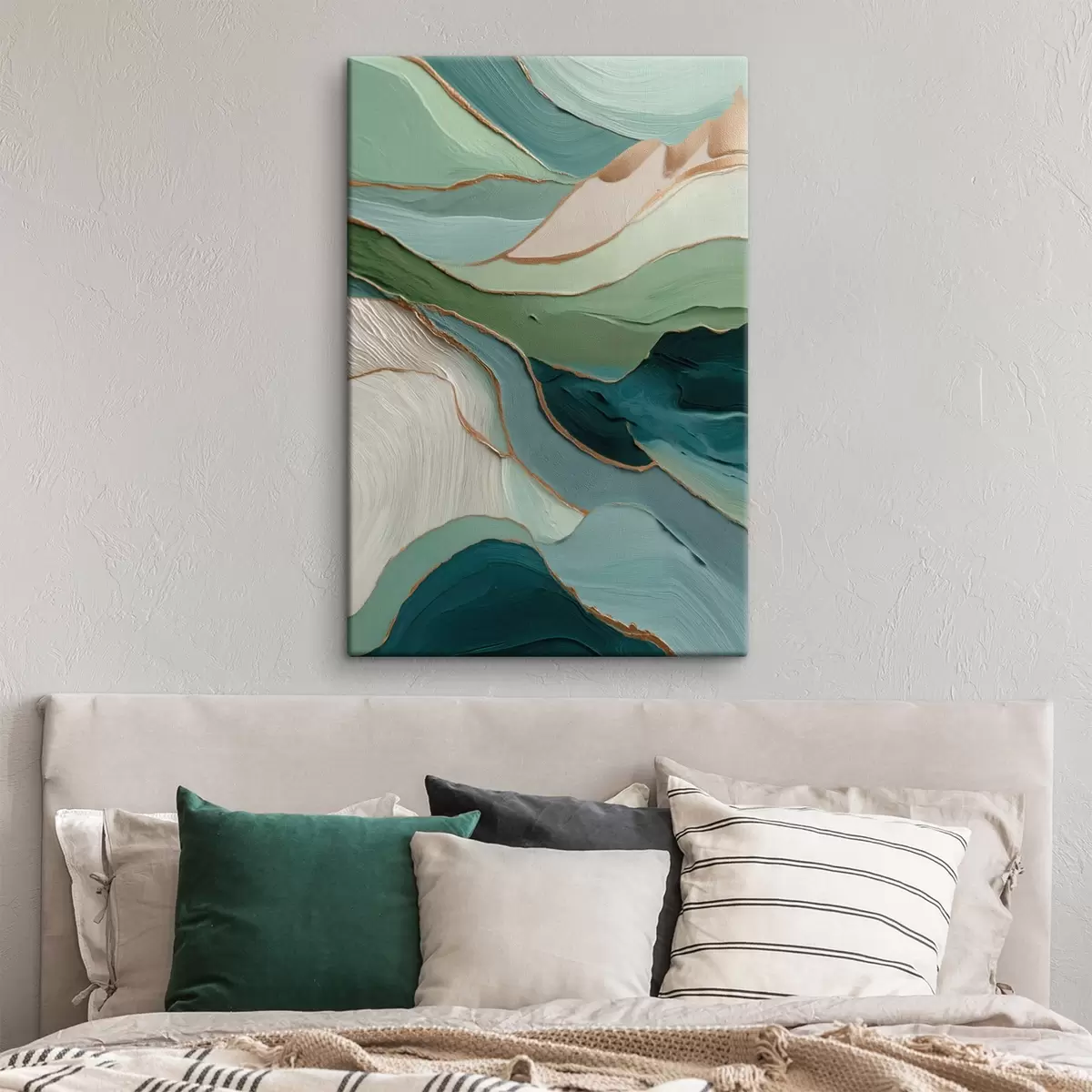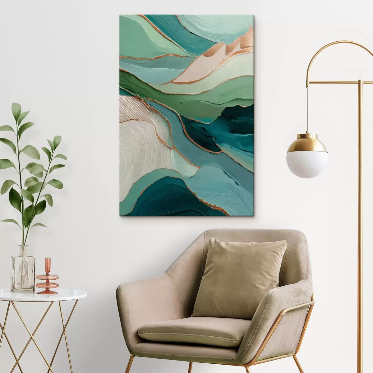 Peinture Abstraction verte en couches avec des lignes jaunes et de la profondeur Art. s45902