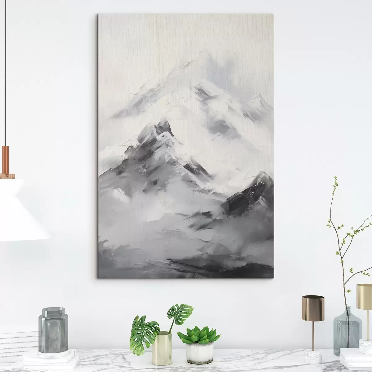 Peinture Sommets enneigés avec des ombres grises, ciel gris, coups de pinceau, texturé, minimaliste Art. s45933