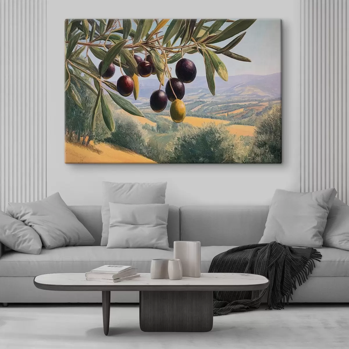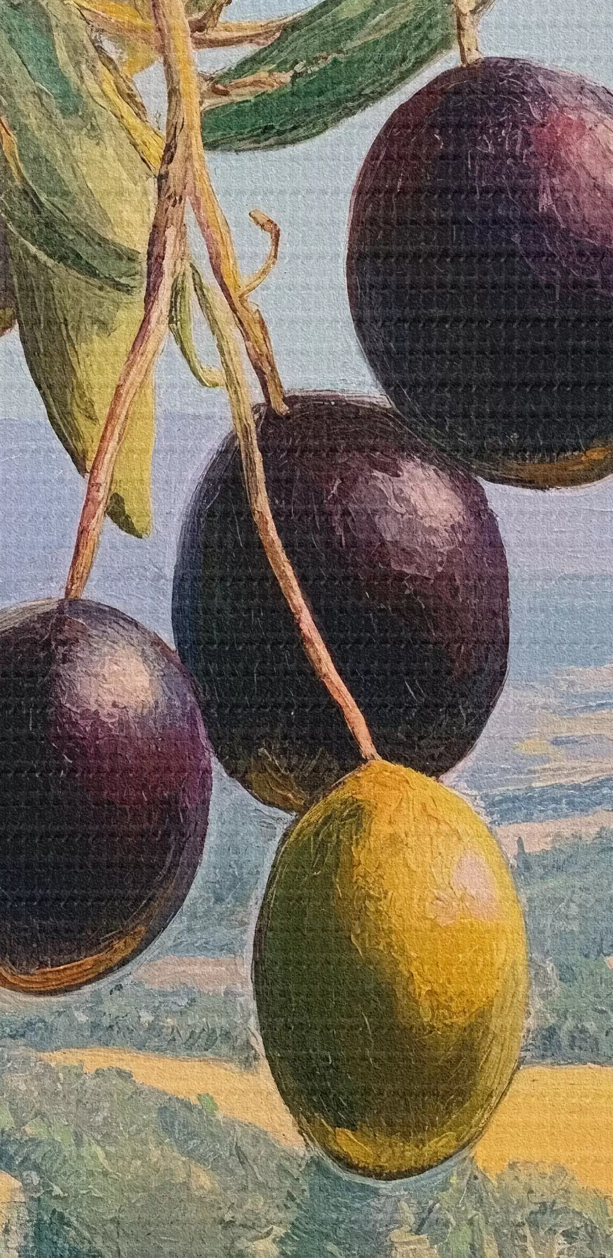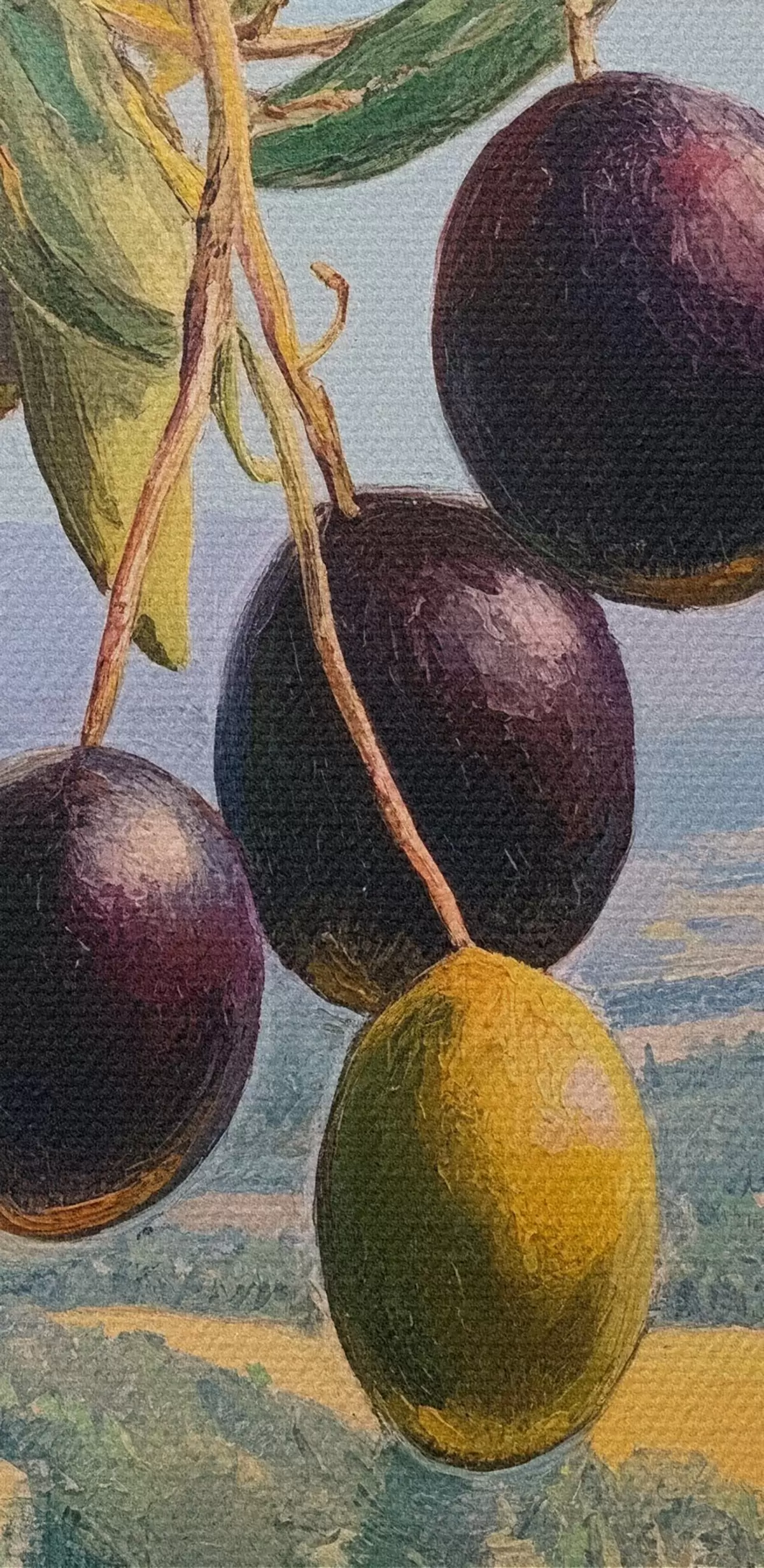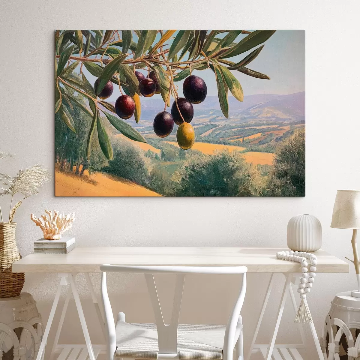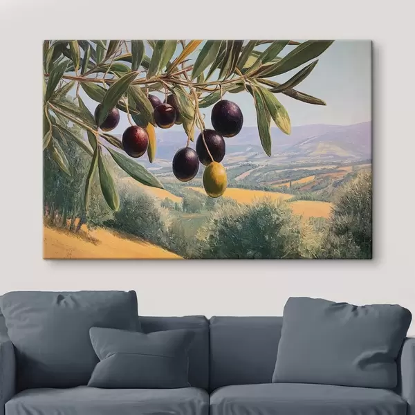 Peinture Branche d'olivier avec des fruits noirs sur fond de paysage estival Art. s46150