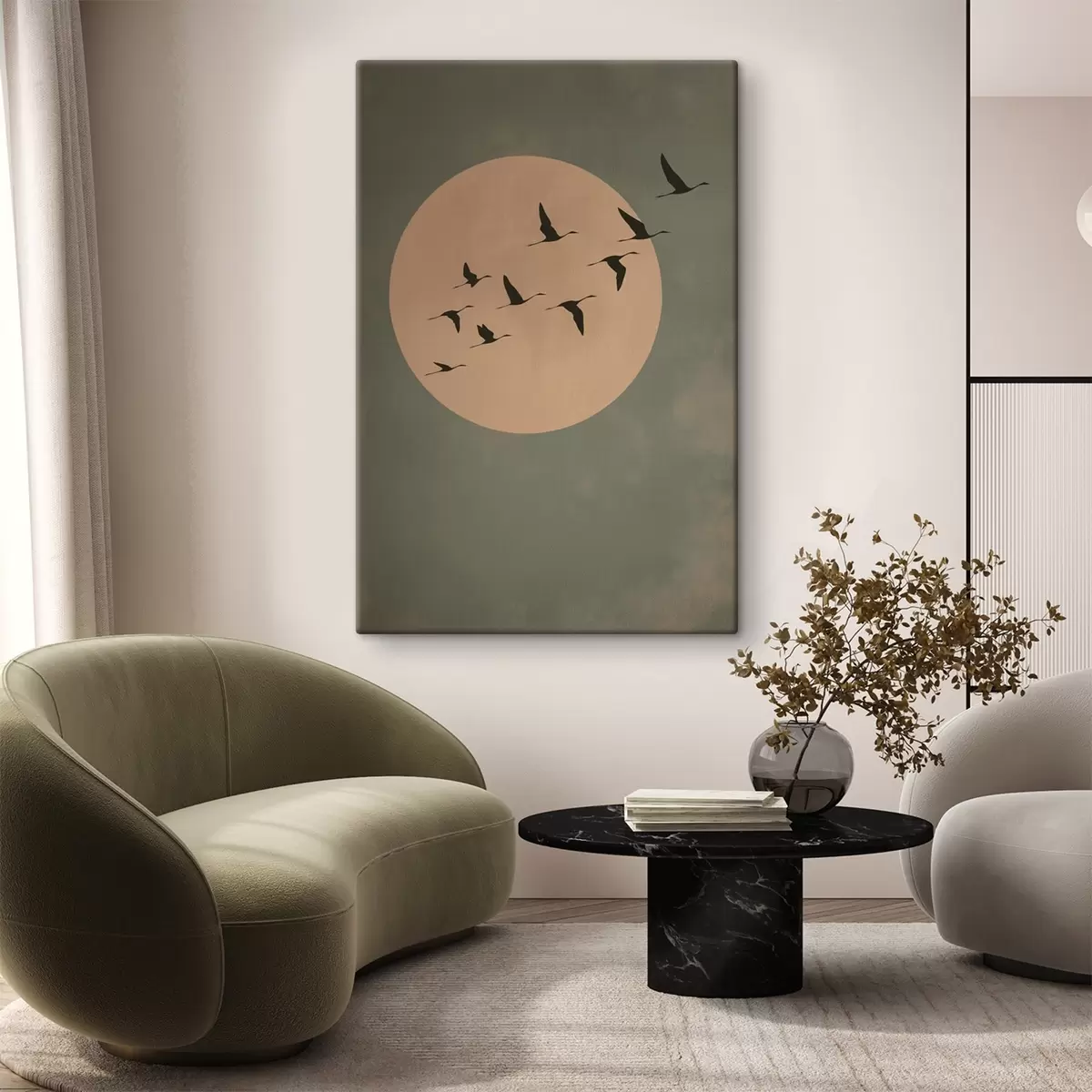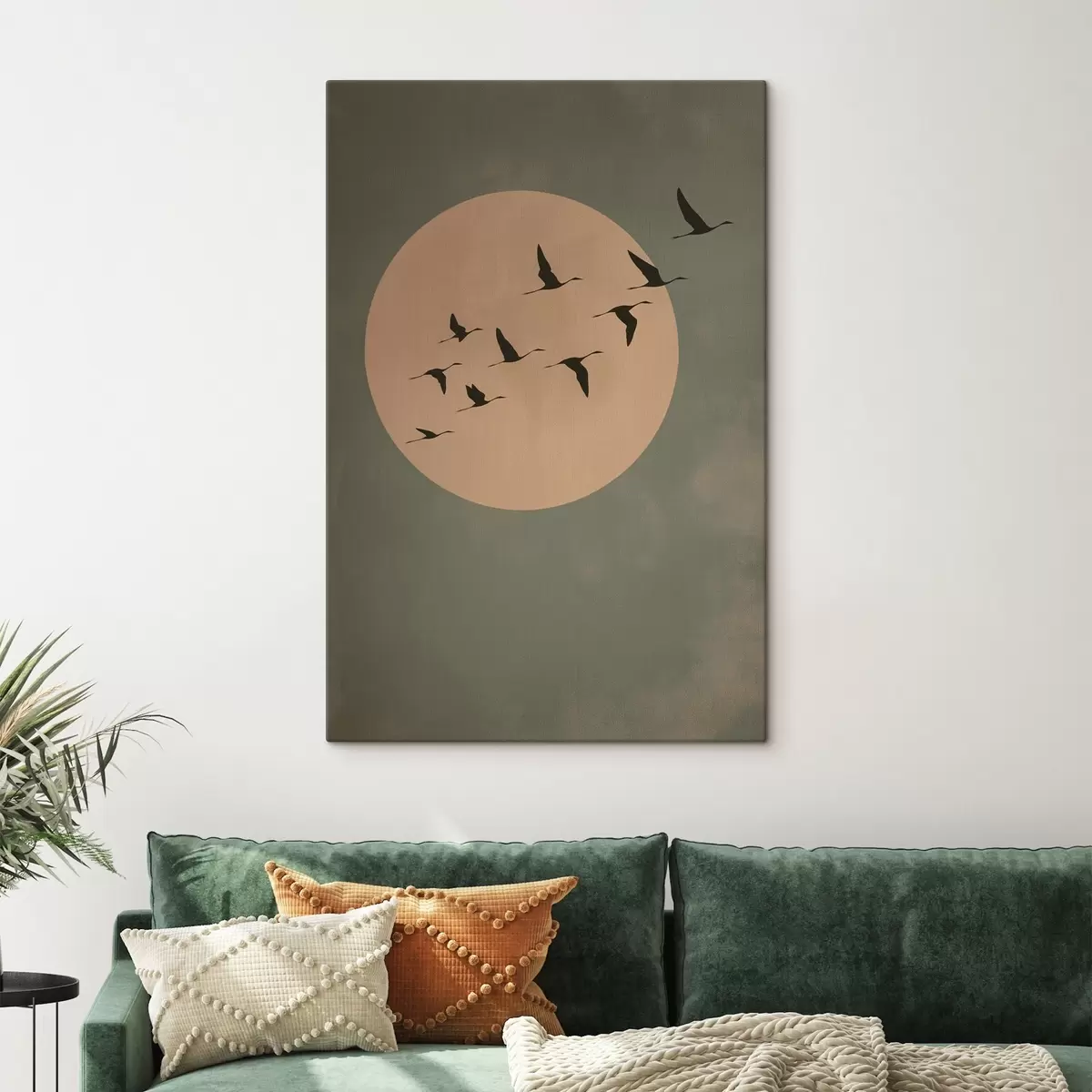 Peintures Une volée d'oiseaux volant devant une grande lune chaude s46162
