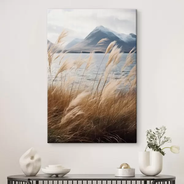 Peinture Herbe de la pampa avec un lac et des montagnes en arrière-plan, éclairage tamisé, couleurs douces, style naturaliste Art. s46283