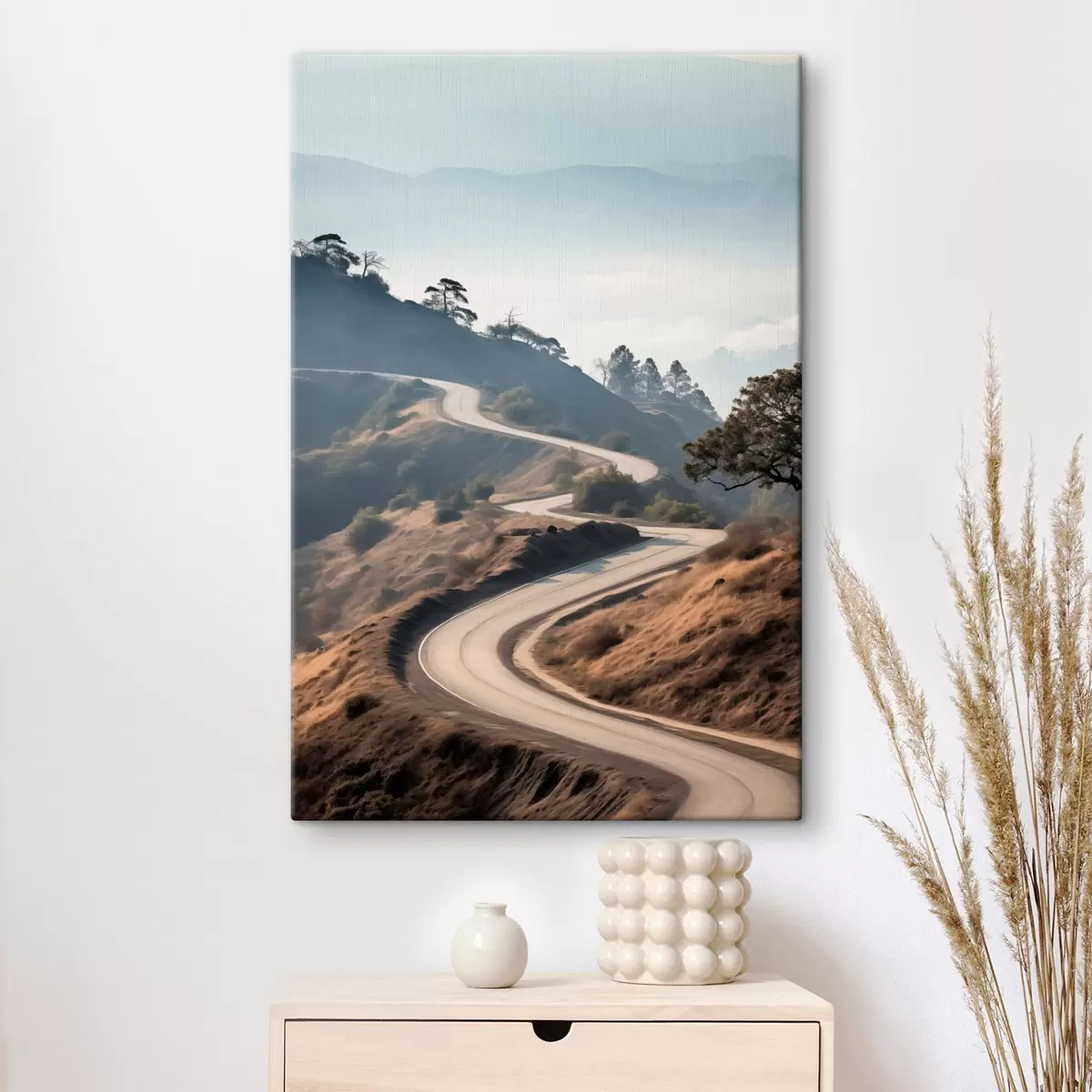 Peinture Une route sinueuse à travers un paysage vallonné recouvert d'herbe sèche, sous un ciel clair, avec des montagnes au loin Art. s46289