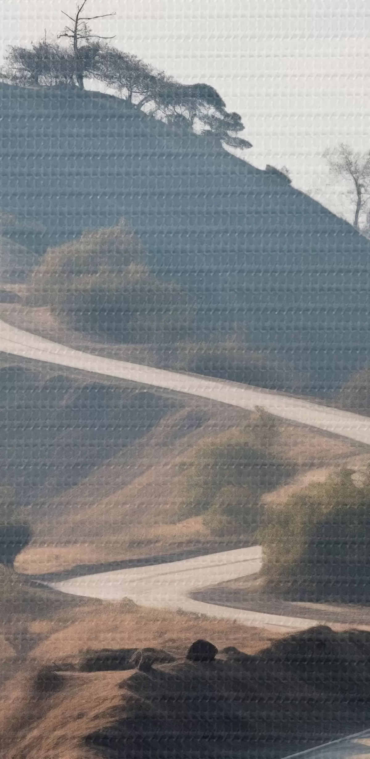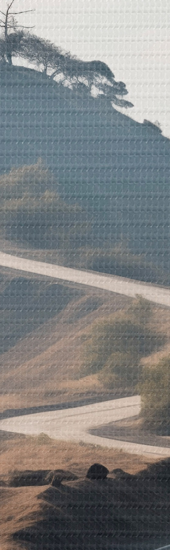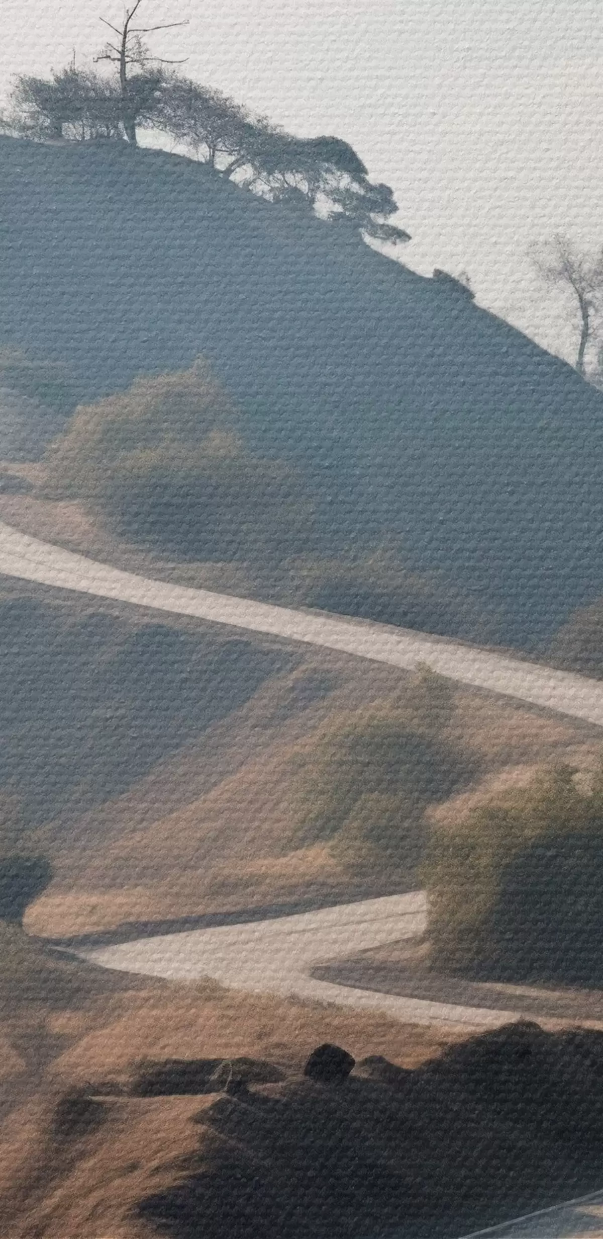 Peintures Une route sinueuse à travers un paysage vallonné recouvert d'herbe sèche, sous un ciel clair, avec des montagnes au loin s46289