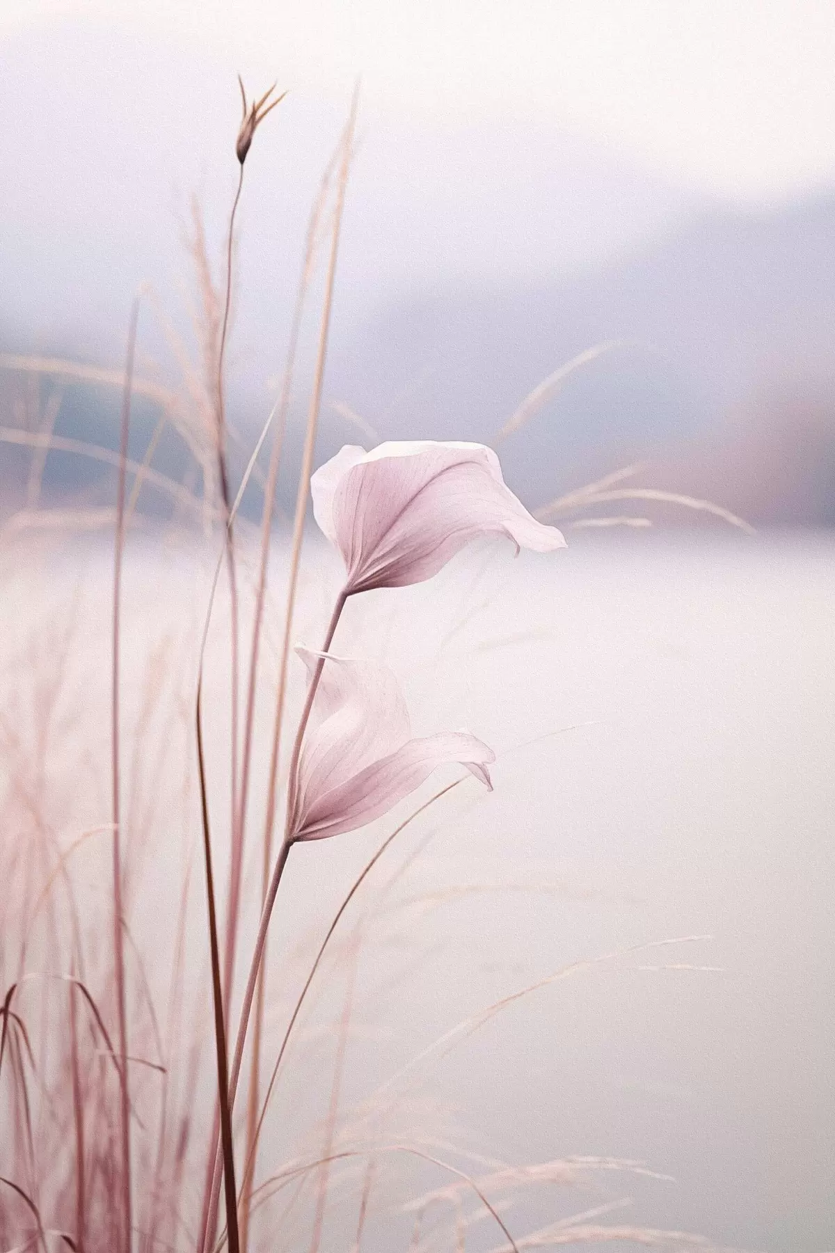 Peintures Délicates fleurs roses au bord d'un lac paisible s46503