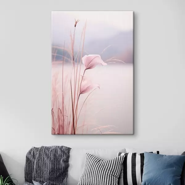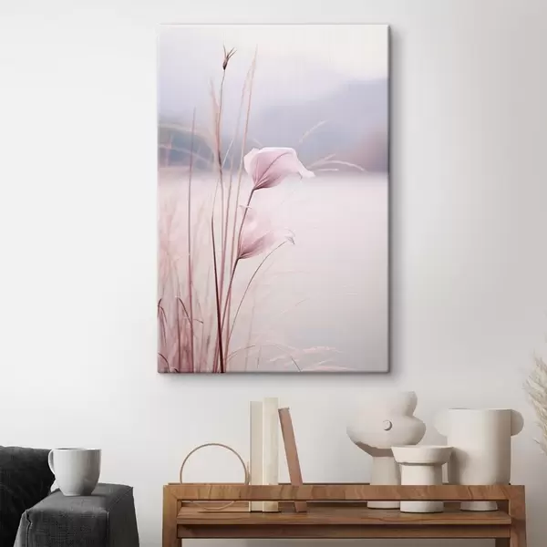 Peinture Délicates fleurs roses au bord d'un lac paisible Art. s46503