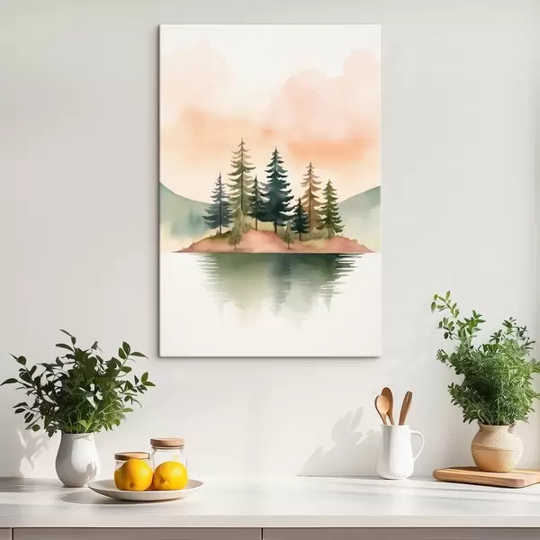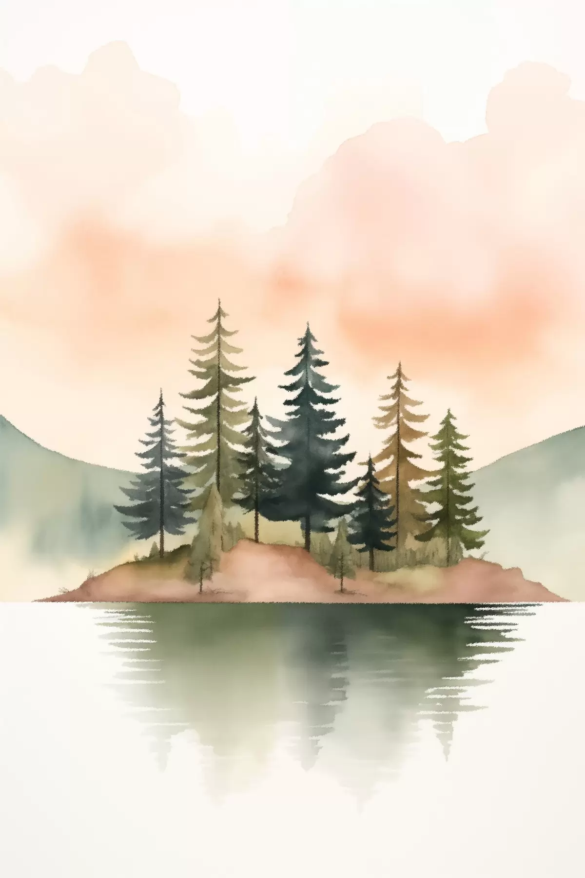 Peinture Pin aquarellé sur un îlot brumeux, ciel couleur pêche tendre Art. s46505