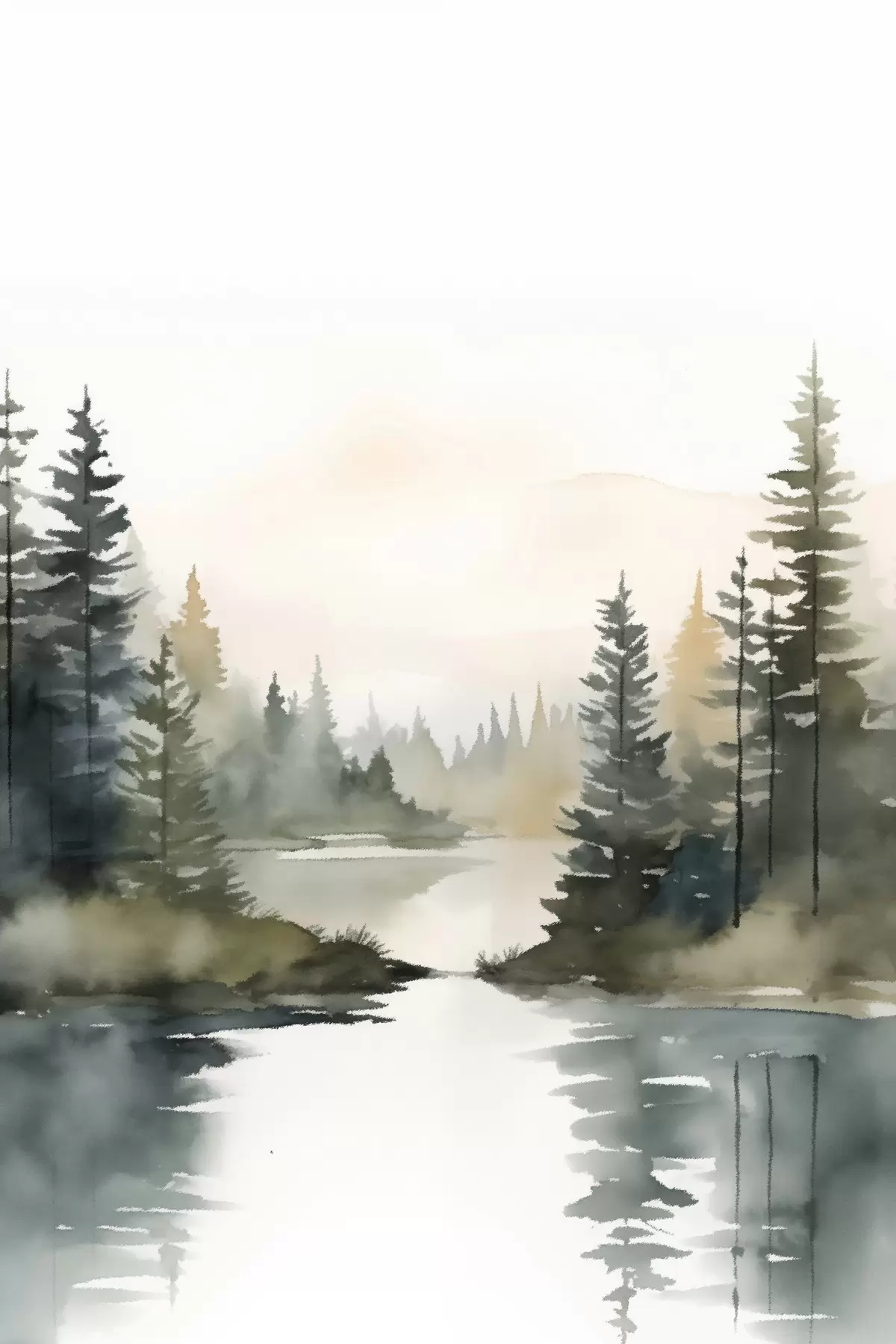 Peintures Forêt brumeuse de conifères au-dessus d'une rivière calme, style aquarelle s46507