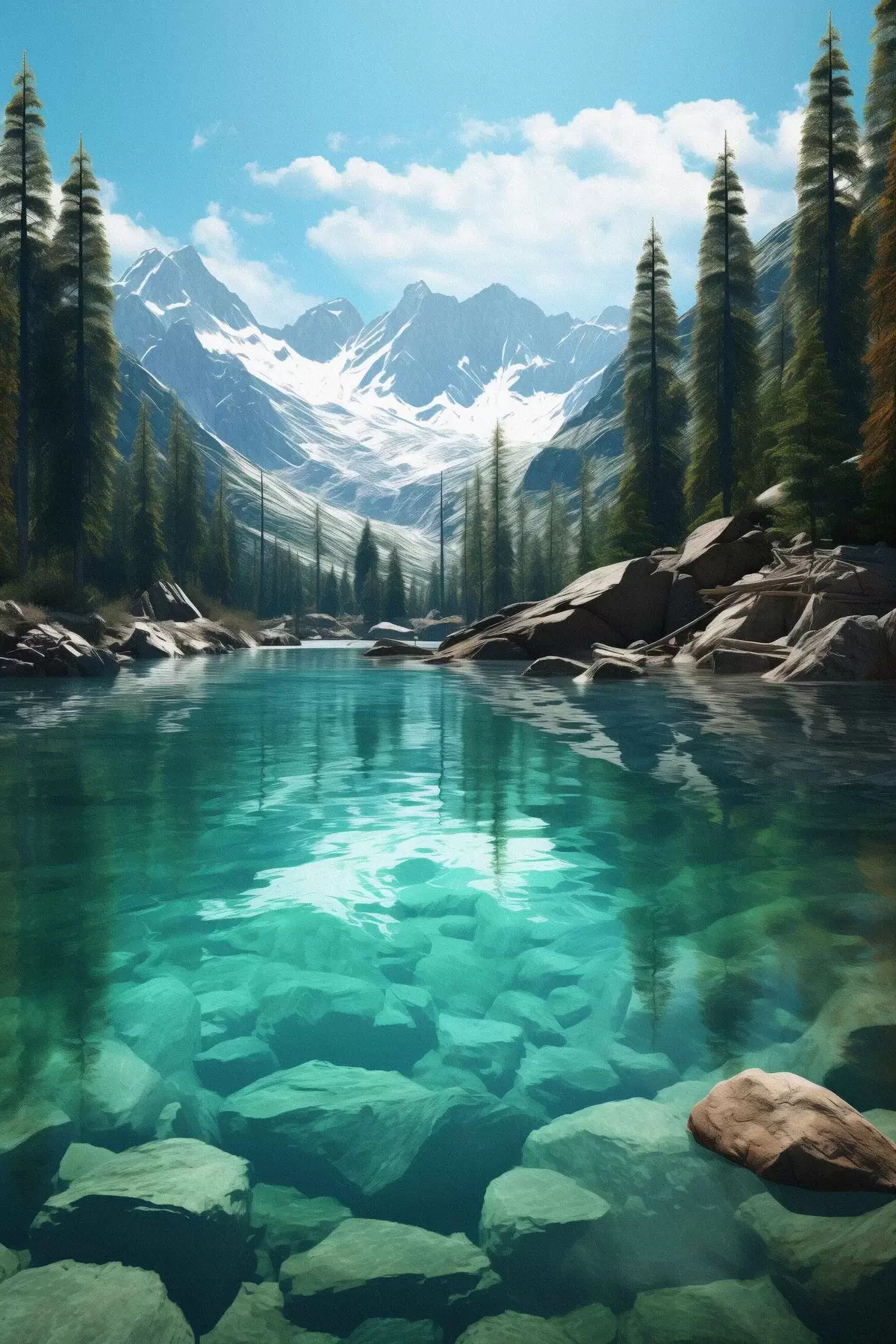 Peinture Rivière alpine limpide avec lit rocheux et sommets enneigés Art. s46514
